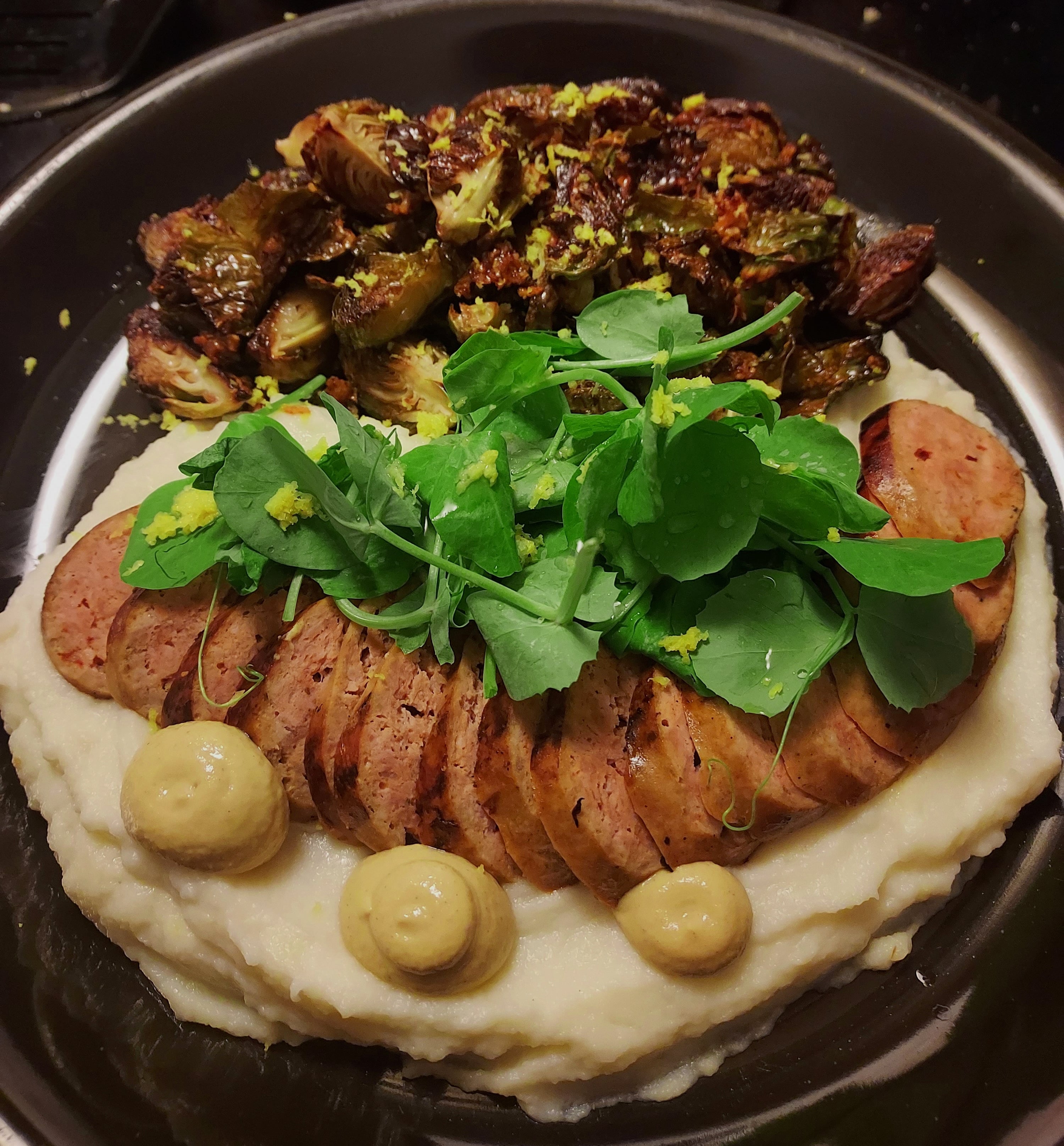 Italian sausage, roasted garlic cauliflower pureé, dijon, honey/garlic butter (c r i s p y) brussels w/ lemon zest & balsamic glaze, pea greens w/ lemon juice/zest.