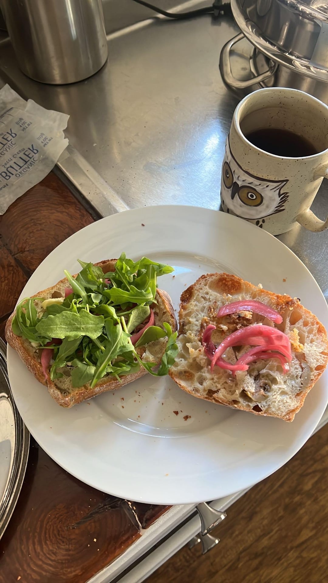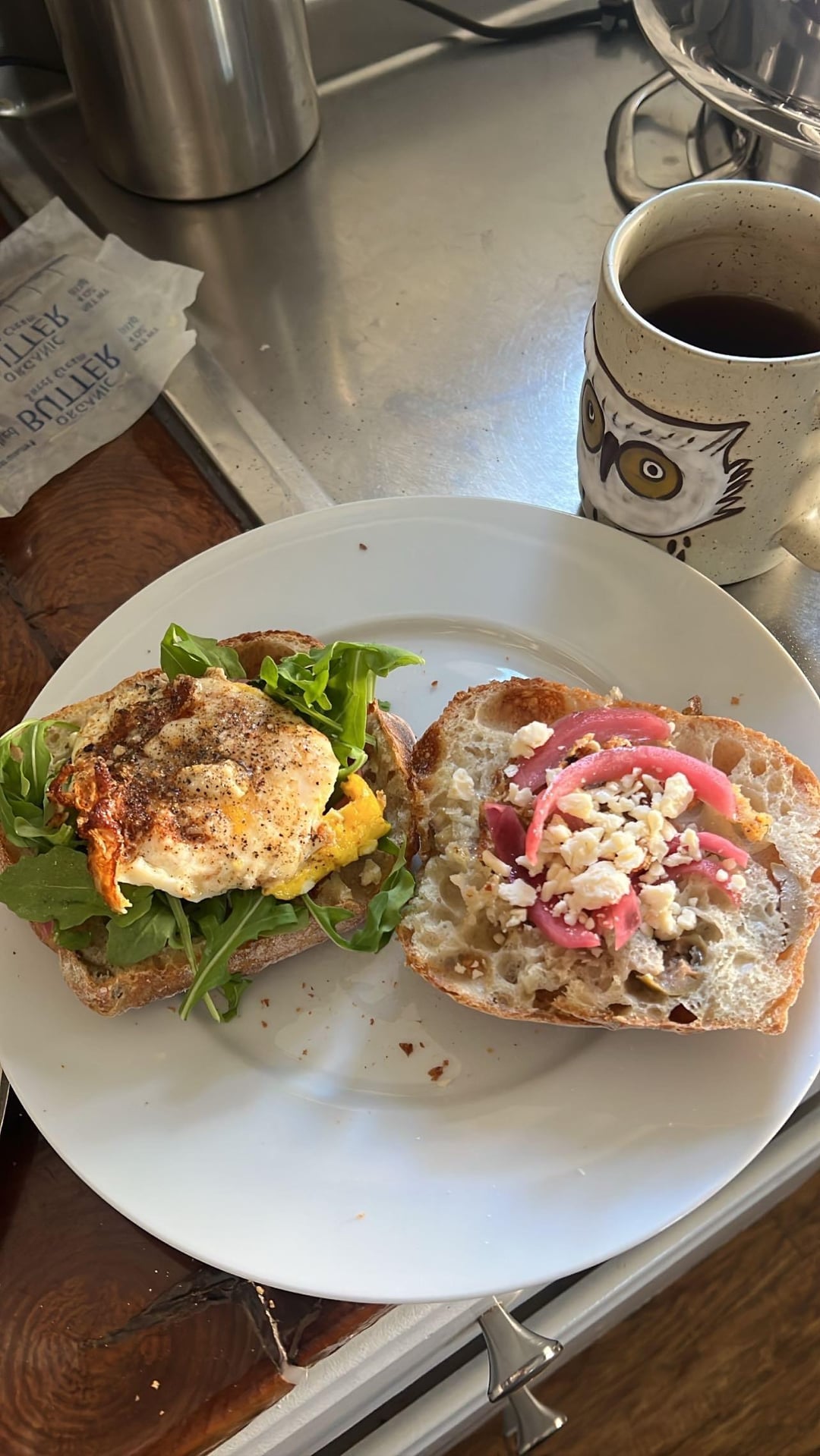 Fried egg cooked with sartori montamore cheese, evoo, garlic powder, salt, paprika, green chile flakes, pepper, and butter on an olive roll, with pickled onions, arugula, butter, and sartori montamore