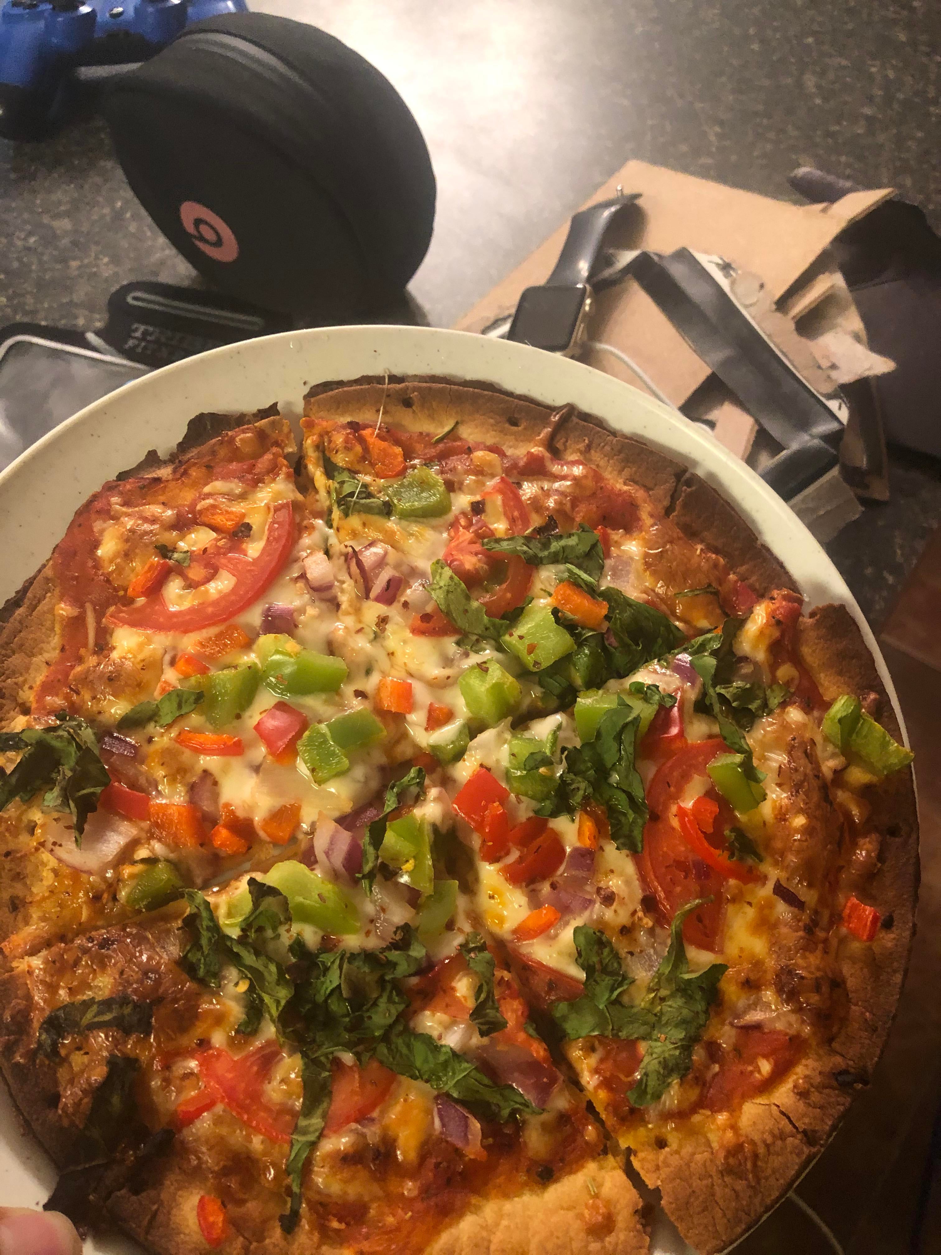 Veggie pizza, on Caulipower crust