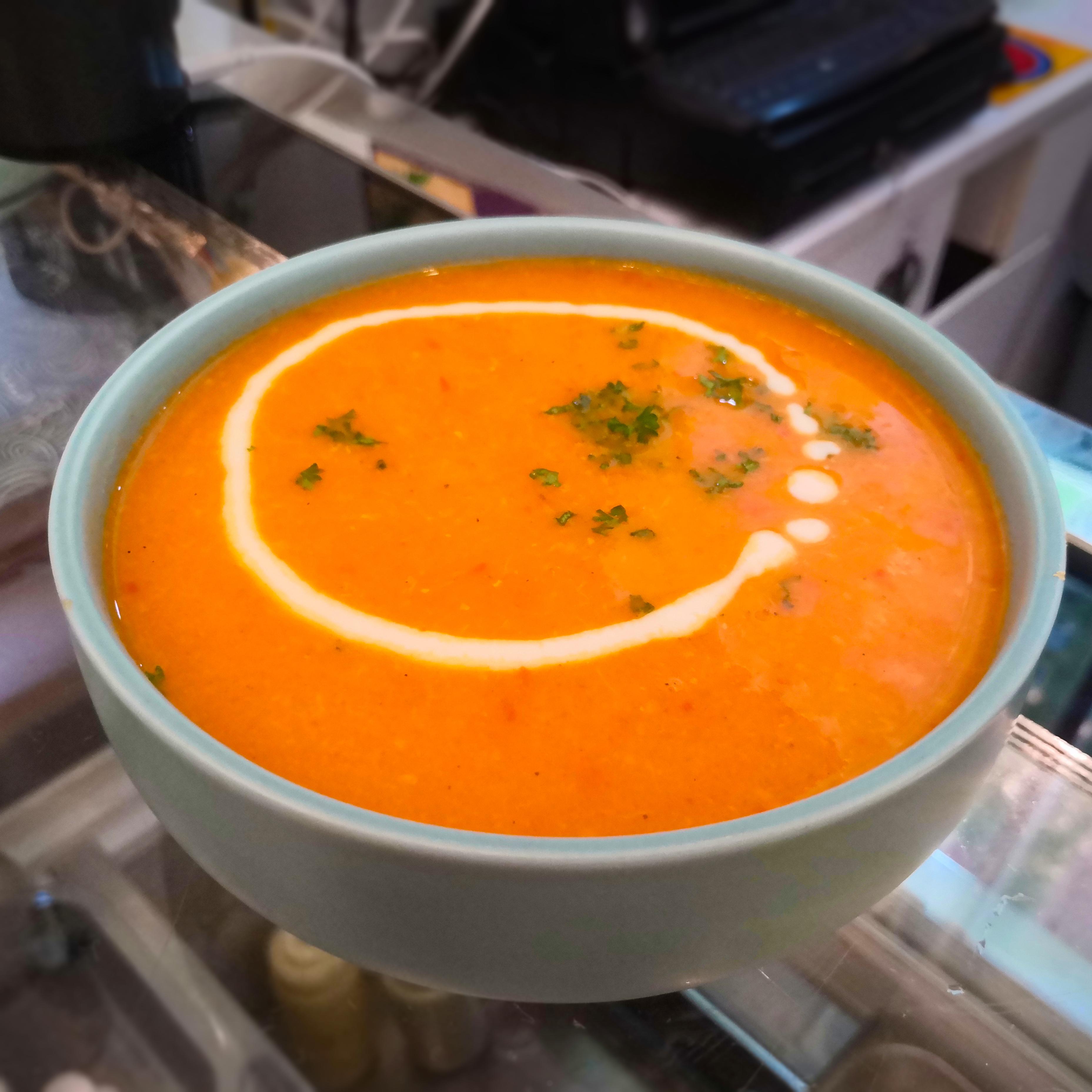 1. Score tomatoes and brush with oil. Roast in a tray at 180C for around 15 minutes. Take them out and let cool down a bit. 2. Meanwhile, prep the celery. Try to get rid of as many of the tough fibers on the outside as possible, then grate or chop the stems to a fine mince. 3. When the tomatoes are cool enough to handle, peel, quarter and cut out the stem. Heat a pot to medium high, add a bit of oil, and fry the minced celery until it smells great, but no need to brown it. Add some powdered spices, but we don’t want to overpower the vegetable and herb flavour. Fry for a few seconds and lower the heat. 4. Add quartered tomatoes and fry together, mashing the tomato with a spatula as they soften, and let the flavour develop. Once the tomatoes have cooked for a few minutes, add the breadcrumbs, stir together, and let it cook for another minute. 5. Add salt, tomato paste, sweetener (if using) and water. Once it’s boiling, add the dried herbs and let it cook on low heat, covered, for around 10 minutes. 6. Take it off the stove and let it cool down a bit, then blend it smooth with an immersion blender. Taste and adjust seasoning, then serve. Top the bowls with a sprinkle of herbs and some plant cream.
