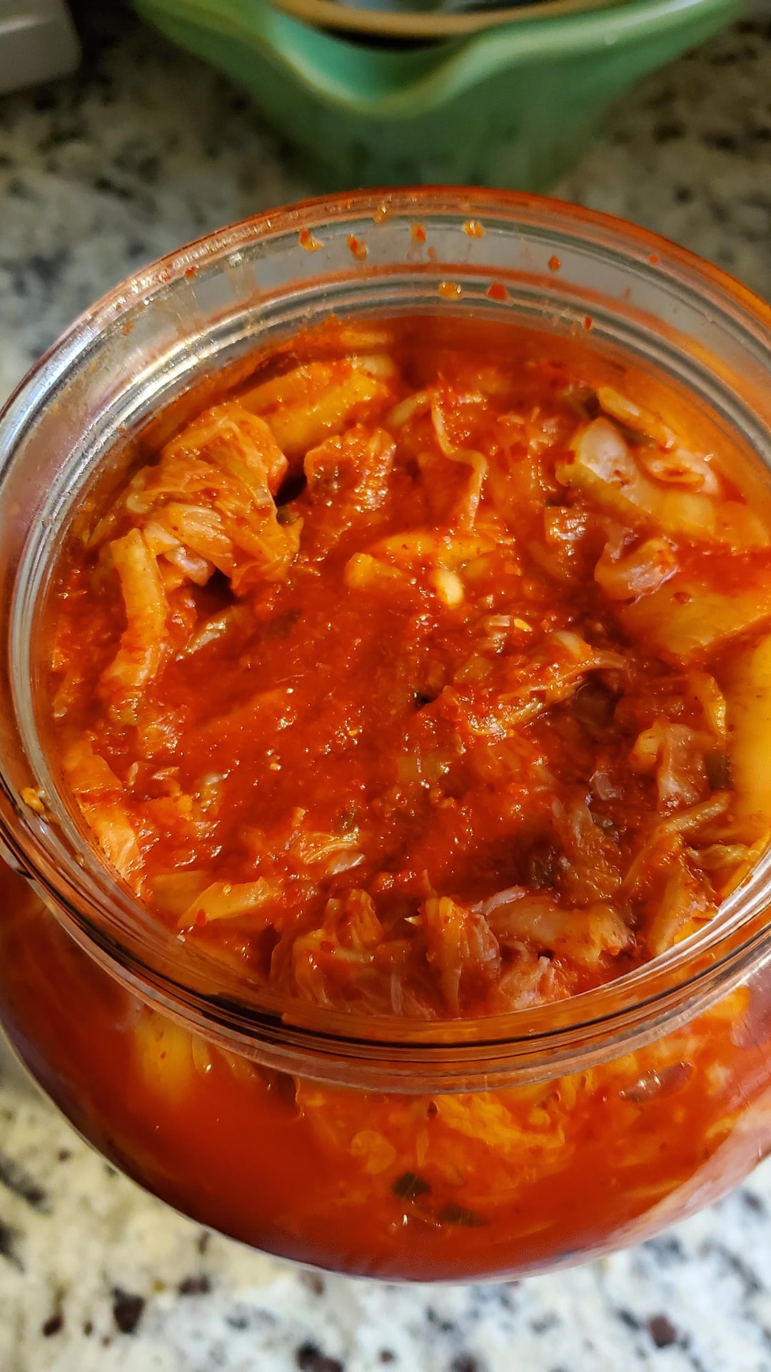 My neighbor made homemade kimchi with his own hot peppers and I get the first batch. Lucky me!