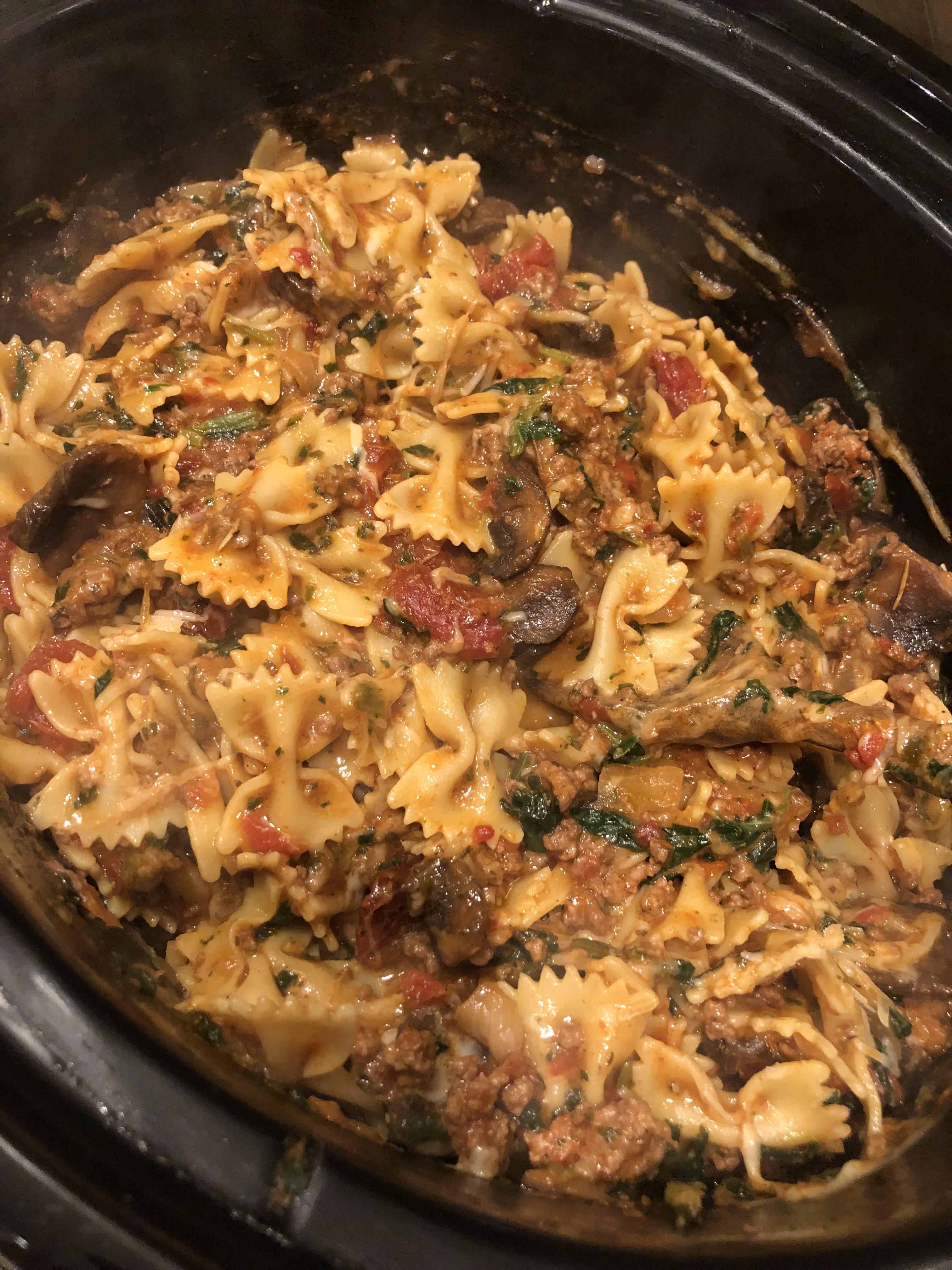 TatteredFinery 2 years ago RECIPEINGREDIENTS:Ingrédients :– 2 lbs. lean ground beef or turkey or meat substitute– 1 yellow onion, chopped in chunks– 2 clove garlic, minced-1 (15 oz.) can tomato sauce– 1 (15 o) can stewed tomatoes– 1 8.1 jar Classico sun-dried tomato pesto or comparable– 1 tsp. oregano– 2 tsp. Italian seasoning– 1/2 tsp rosemary– salt/pepper to taste– 10 oz. frozen spinach, thawed (can also use fresh spinach)– 16 oz frag baby hello or mushrooms or your choice.– 14.5 oz. bowtie pasta, cooked– 1/2 cup parmesan cheese, shredded– 1 1/2 cup mozzarella, shredded.INSTRUCTIONS:1. Brown ground meat with onion and garlic with all spices and salt and pepper to preference.2. Put meat mixture in slow cooker3. Sauté the mushrooms in same pan with added. Butter or oil as necessary + salt and pepper to taste again.4. Put in crock-pot and add sauces, tomatoes and seasonings.5. Cook for 6-7 hours on low or 3-4 on high6. Add the last 4 ingredients during the last 5-10 minutes of cooking or long enough for spinach to Willy cheese to melt.6. Serve with Parmesan on top.6. Enjoy!Note: in future I’d thaw the spinach with some butter and garlic powder mixed in before adding.