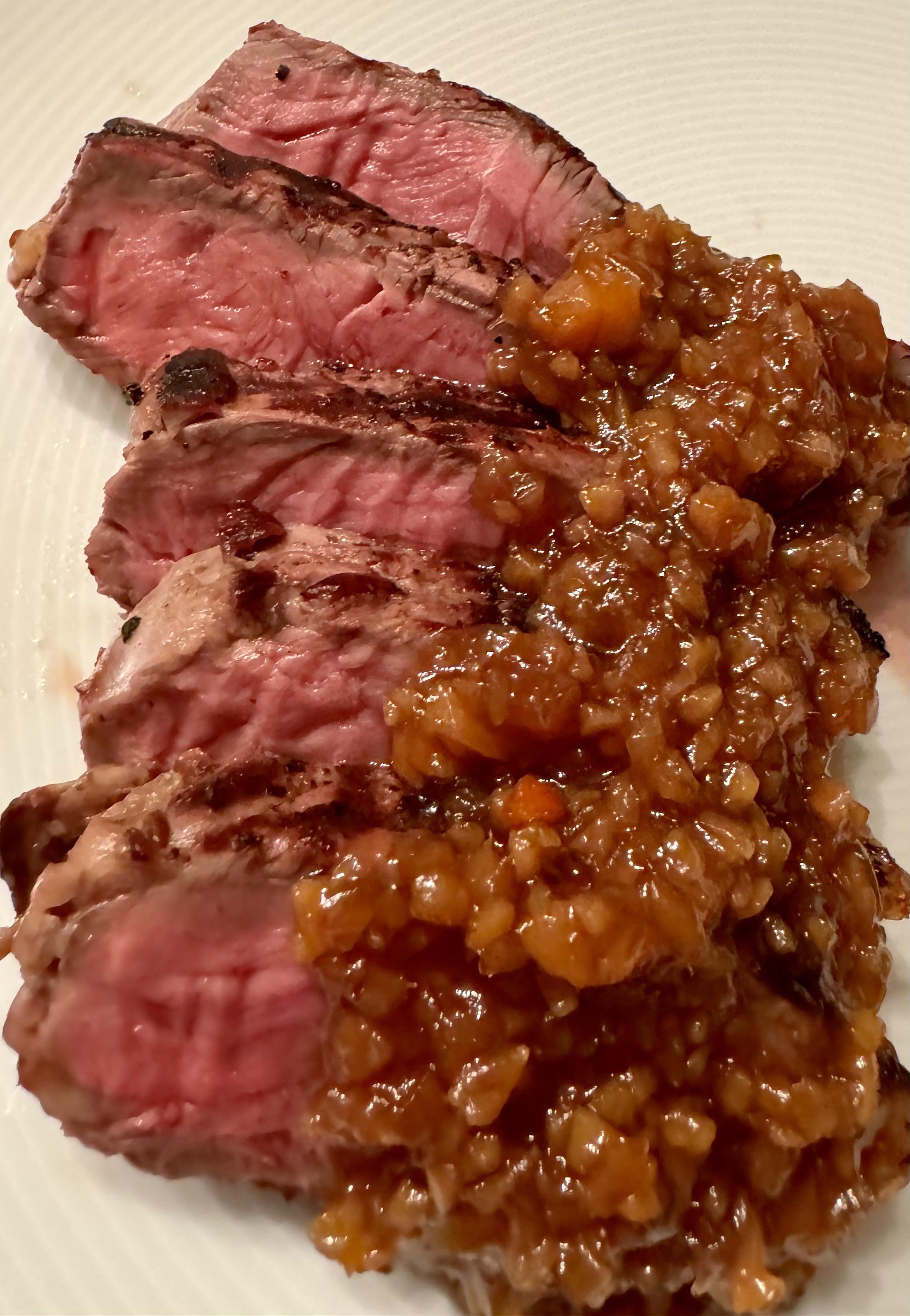 Grilled sirloin steak with candied garlic, ginger and shallot