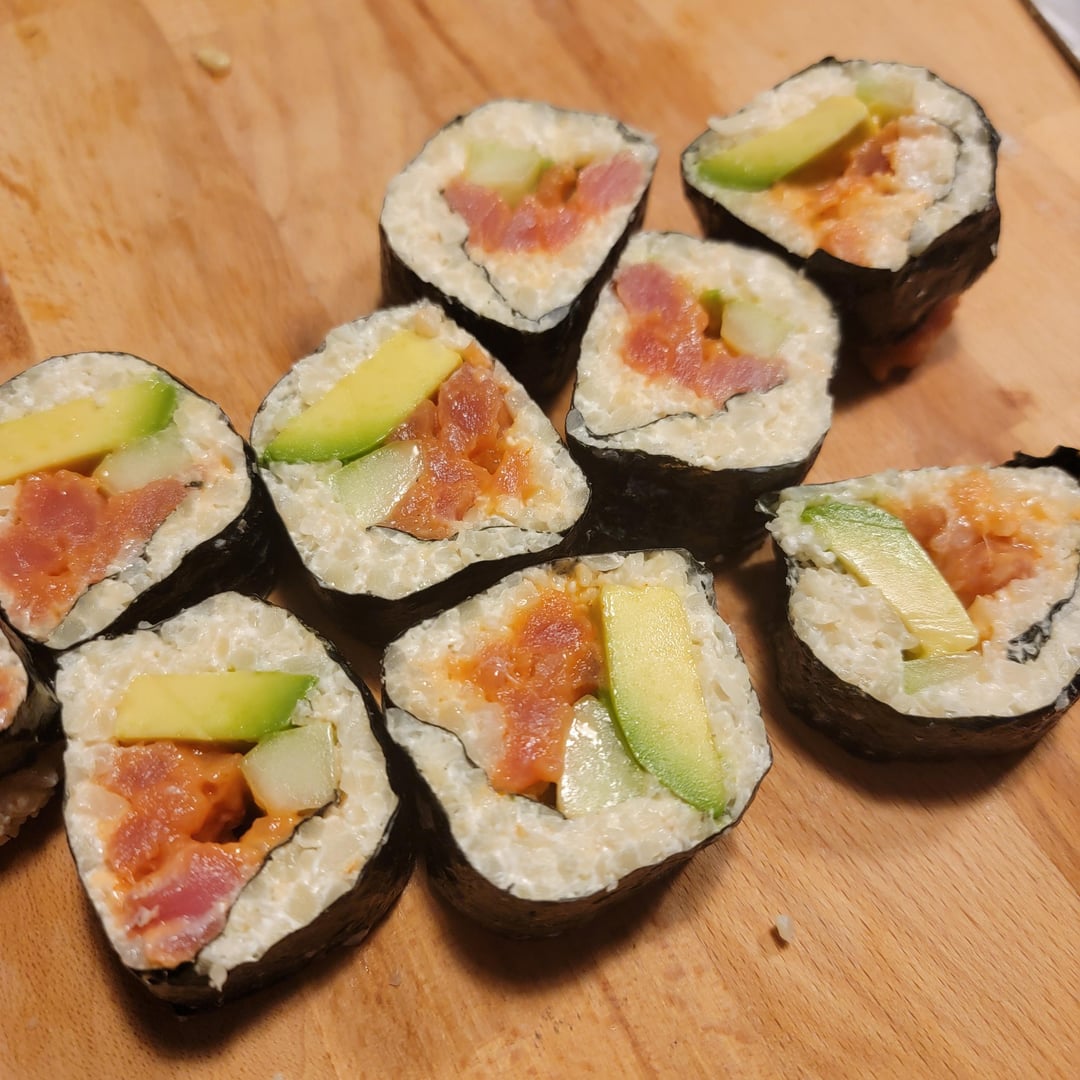 Place the Nori on your cutting board, shiny side down. Add the rice mixture on top of the nori leaving about one inch gap at the top period otherwise spread the rice out evenly, and a thin layer to cover the entire sheet. Sprinkle with black & white toasted sesame seeds and flip the nori on the reverse side. Put your ingredients on the nori side of the wrap if you’re going for an inside out wrap, otherwise, put the ingredients on the rice side if you’re going for a traditional wrap period. Roll and enjoy