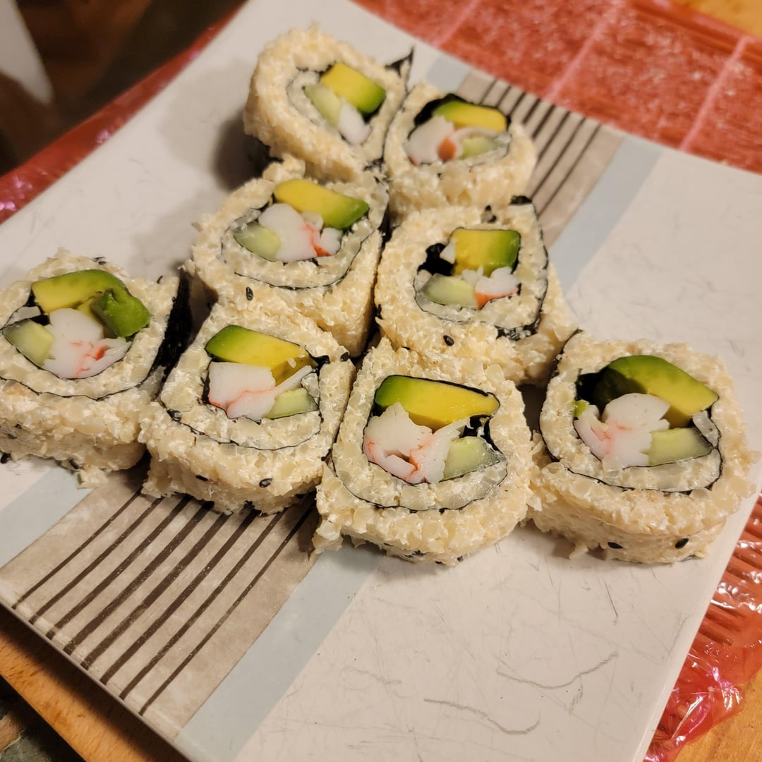 Mix erythritol with vinegar. Add to softened four ounce cream cheese. Steam your rice according to the package instructions and add the rice to the vinegar and cream cheese blend. Refrigerate until cool.