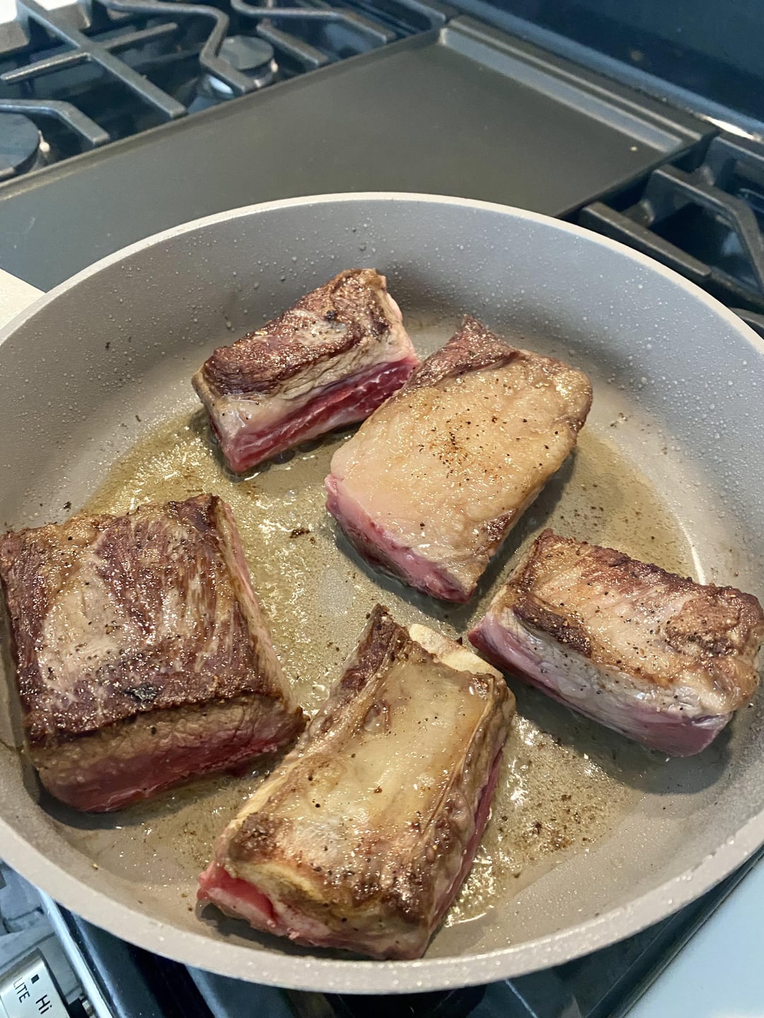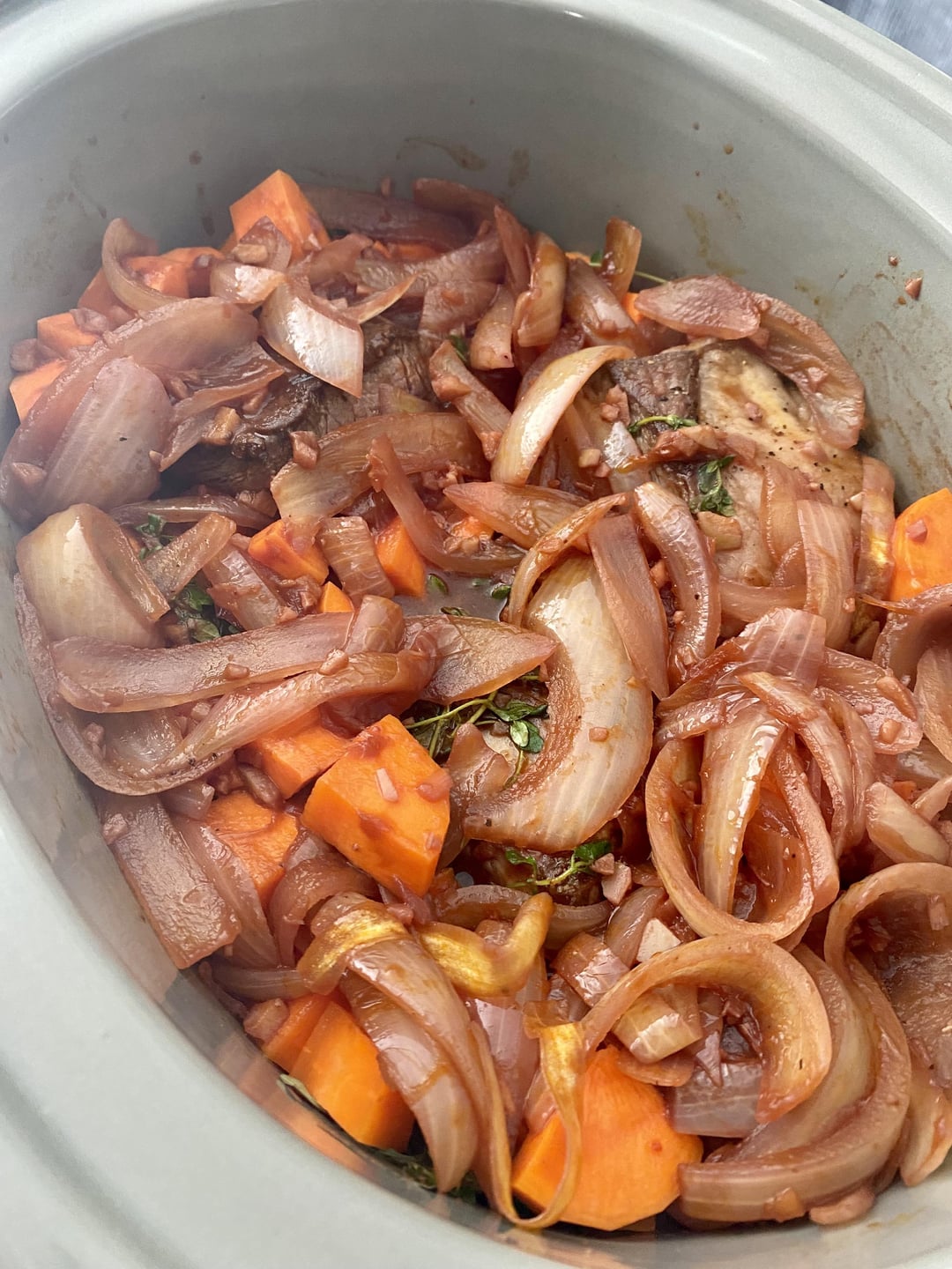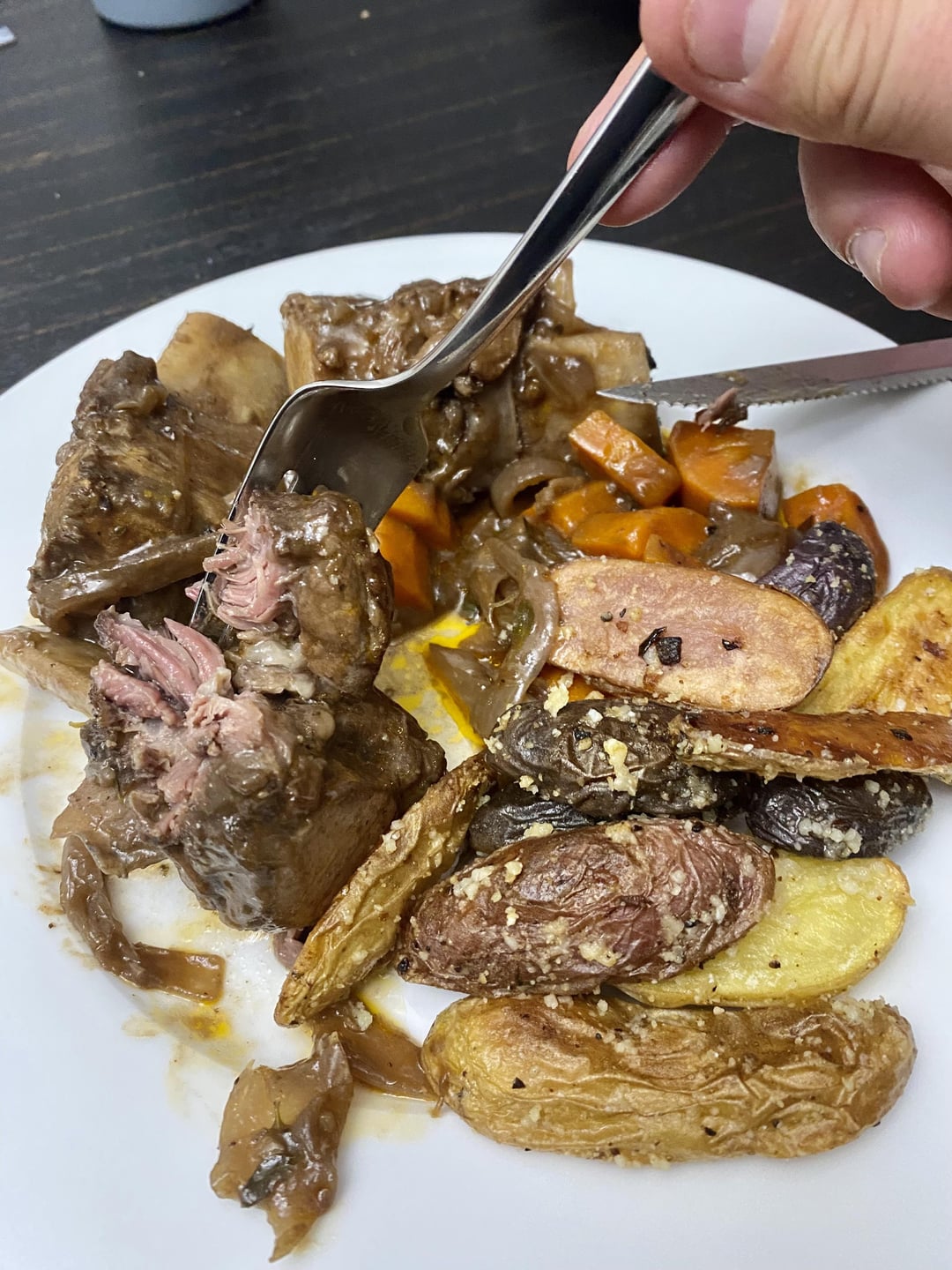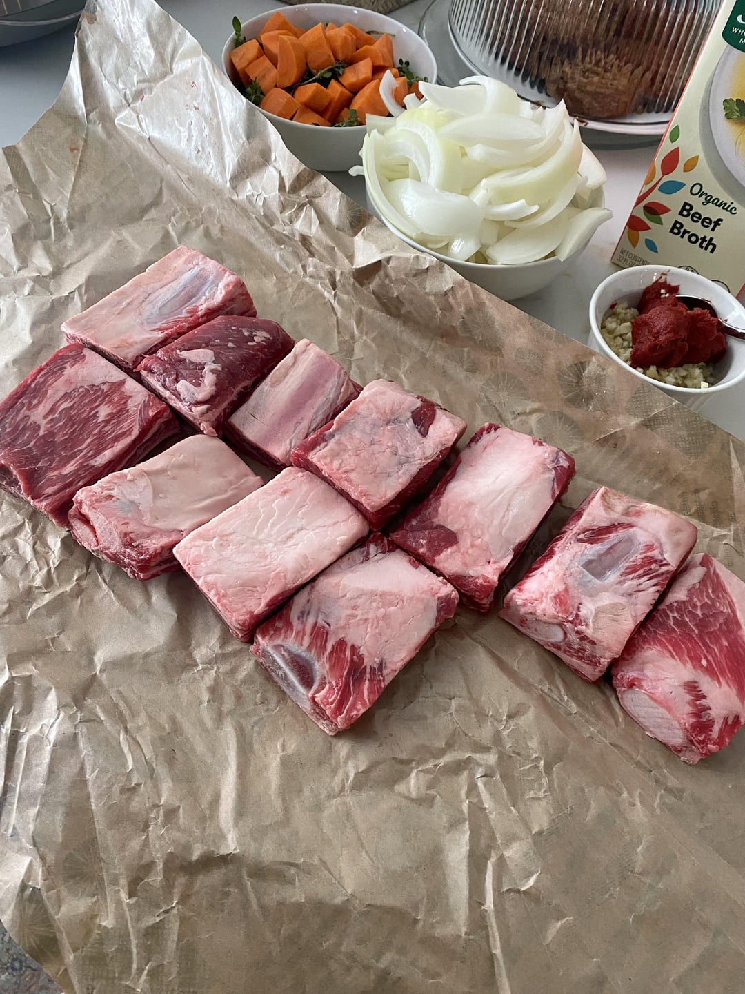Beef Short Ribs, Carrot, Yellow Onion, Garlic, Beef Bone Broth, Red Wine, Tomato Paste, Thyme, Bay Leaf, Salt and Pepper. Sear the meat, cook down the onion, garlic, and tomato paste in red wine in a sauce pan, add everything to crock pot and let it rock for 8-10 hours. (Garlic Parmesan Potatoes Cooked Separately)