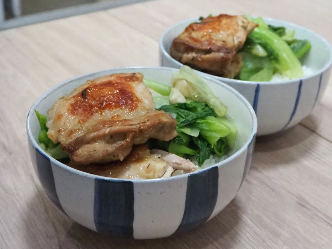 1. Marinade chicken the night before cooking. 2. Preheat oven. Make rice. 3. While rice cooks, lay chicken out on foil- and baking paper-lined sheet pans. Bake at 180C/360F for about 20 minutes. 4. In the meantime, wash and cook vegetables. 5. Assemble and serve.
