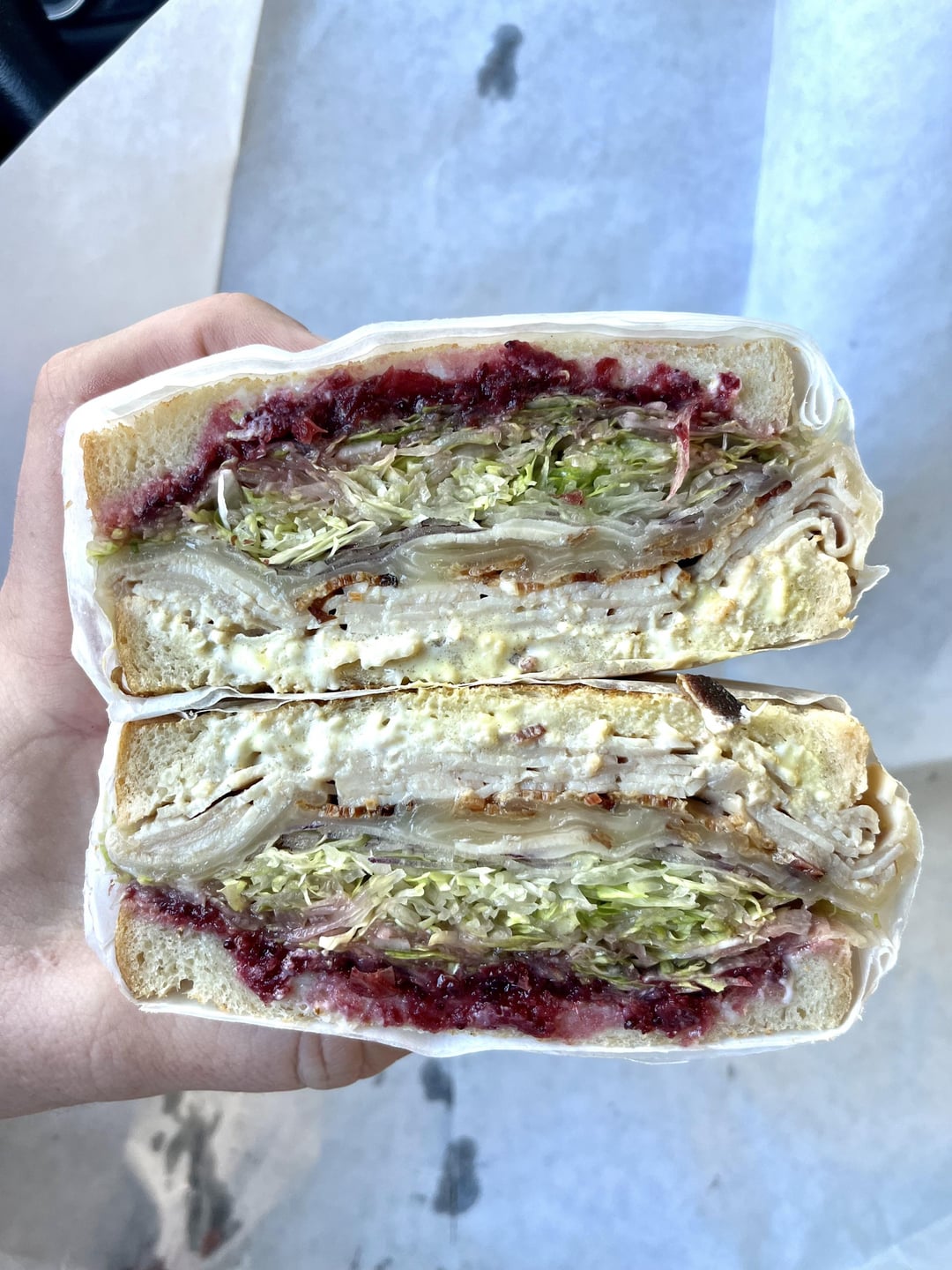House brined and roasted deli style chicken, bacon, melted swiss, cranberry, shredded lettuce, red onion, mayo, mustard, salt, pepper, celery salt on toasted sourdough.