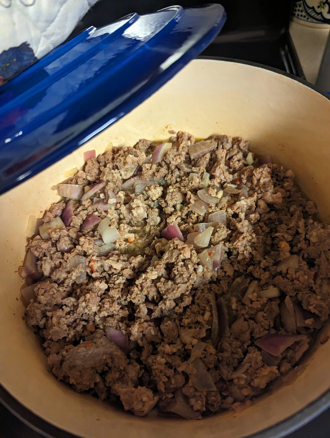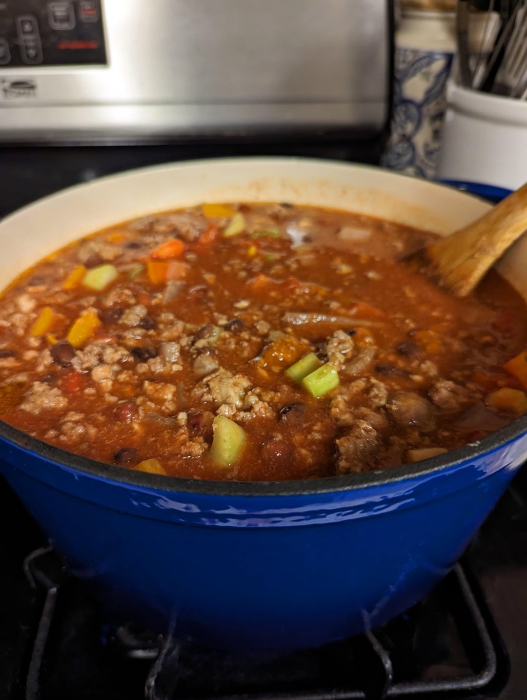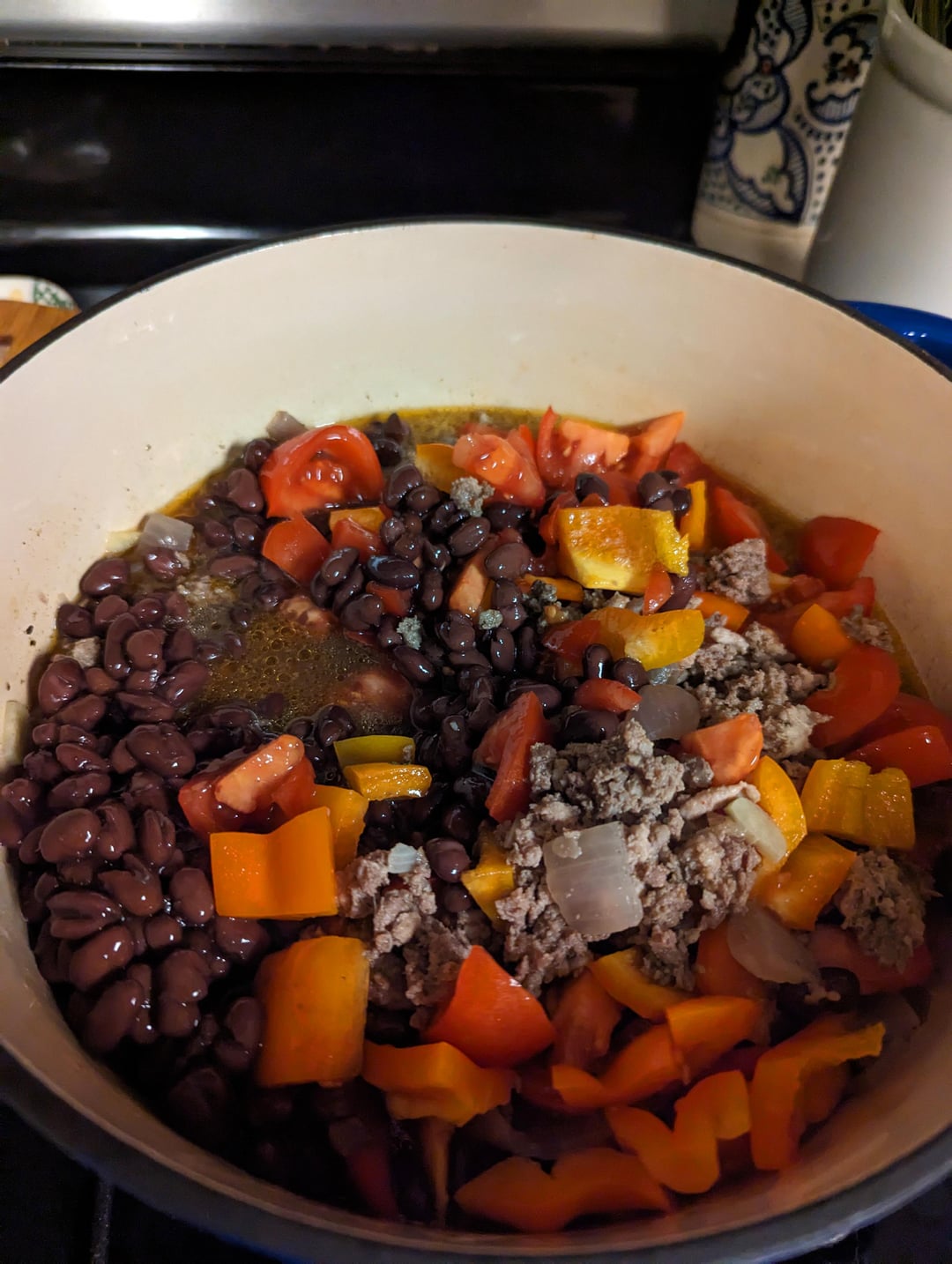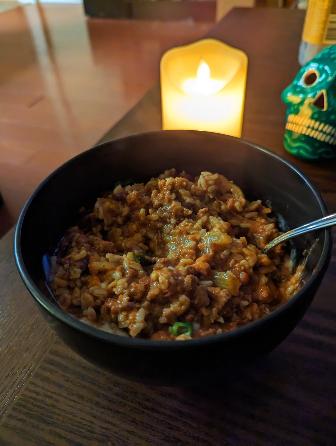 Other ingredients, 1 Onion, 1 Celery Stalk, 4 Cloves of Garlic, 1 Diced Tomato, 1 Diced Orange Bell Pepper, 24 oz of Strained Tomato, Handful of Spicy Peppers including Habanero Jalapeno & Serrano, Various Spices. At the end, added green onions and some Greek yogurt to mix in. It’s also on a bed of brown rice.
