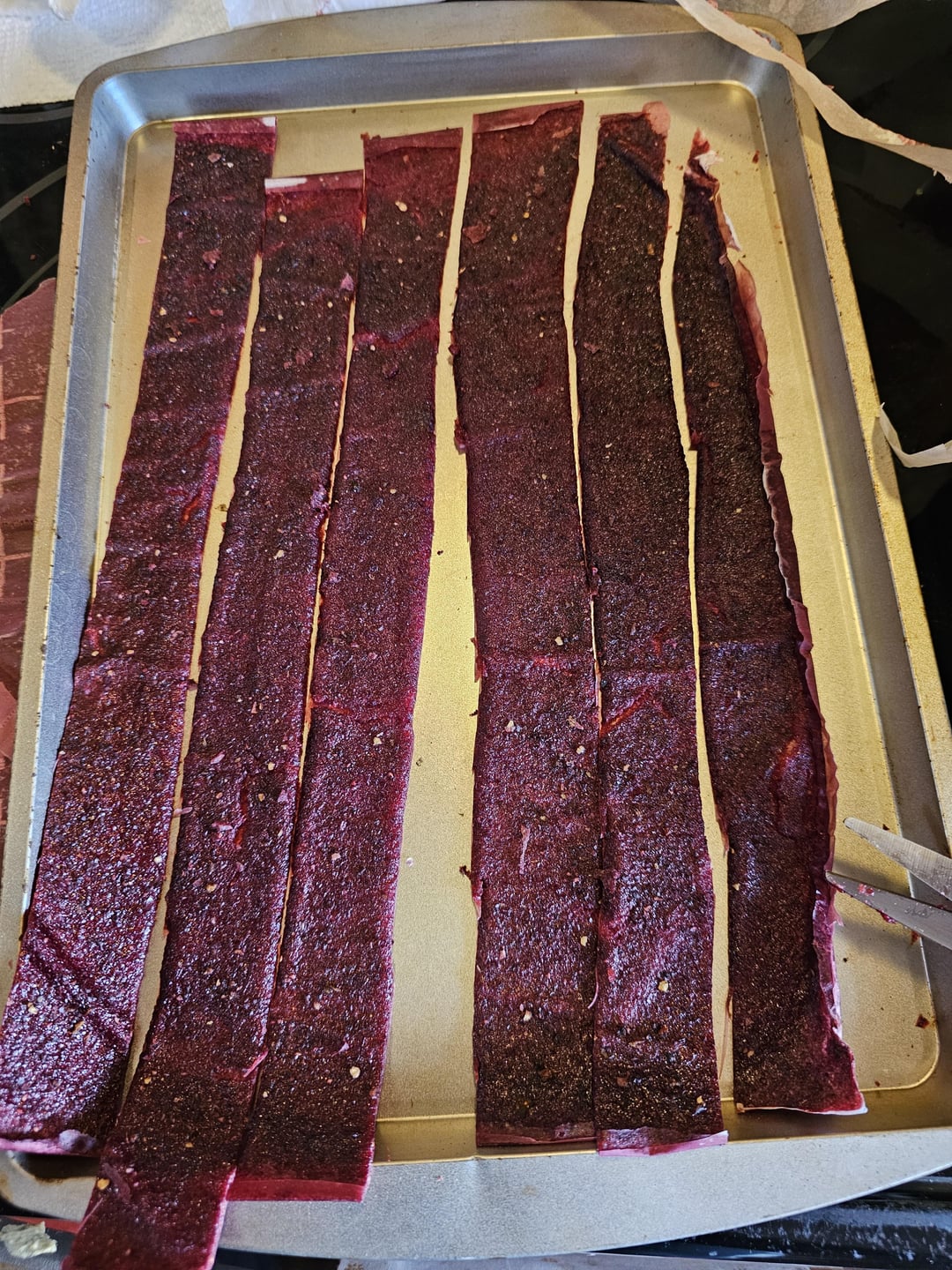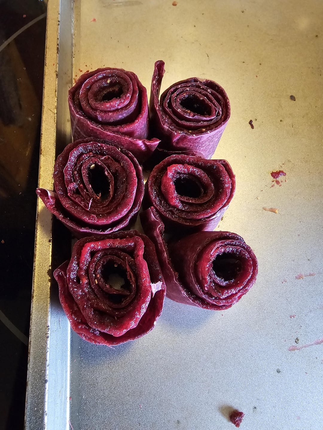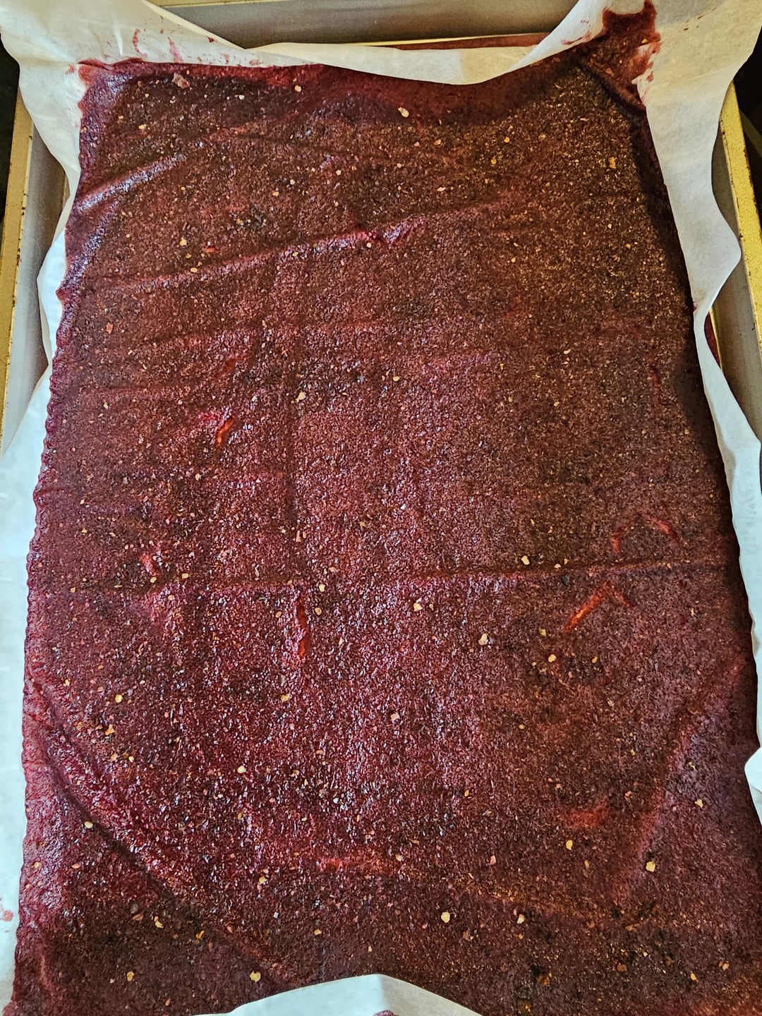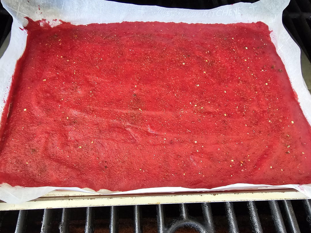 Saw a video for diy fruit roll ups. Making a spicy one sounded like a good idea. 1 container of fresh strawberries and 1 of cranberries, blended then strained. 16 tbs of sugar separated into 2 pans and a blend of habanero, ghost, and reaper powder dusted on top of one. The non spice one is in the kitchen oven, spicy is on the smoker. Lowest oven setting for a few hours until the top isnt sticky anymore. Lips, tongue, and a little burn in the throat currently from eating the first one.