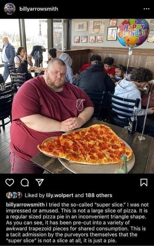 This pizzeria deceptively markets a “super slice”, which is just a pizza in a triangular shape (with trapezoid-shaped sub-slices) instead of a large slice of an enormous pizza.