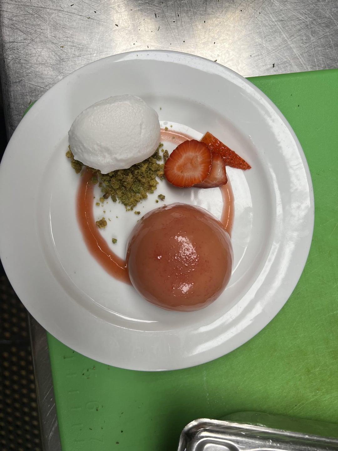 I think you should flatten the sorbet then put everything else the way it is but put the strawberries on top of mouse ,maybe two mint leaves also