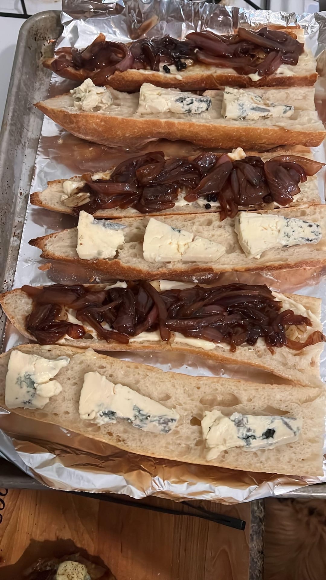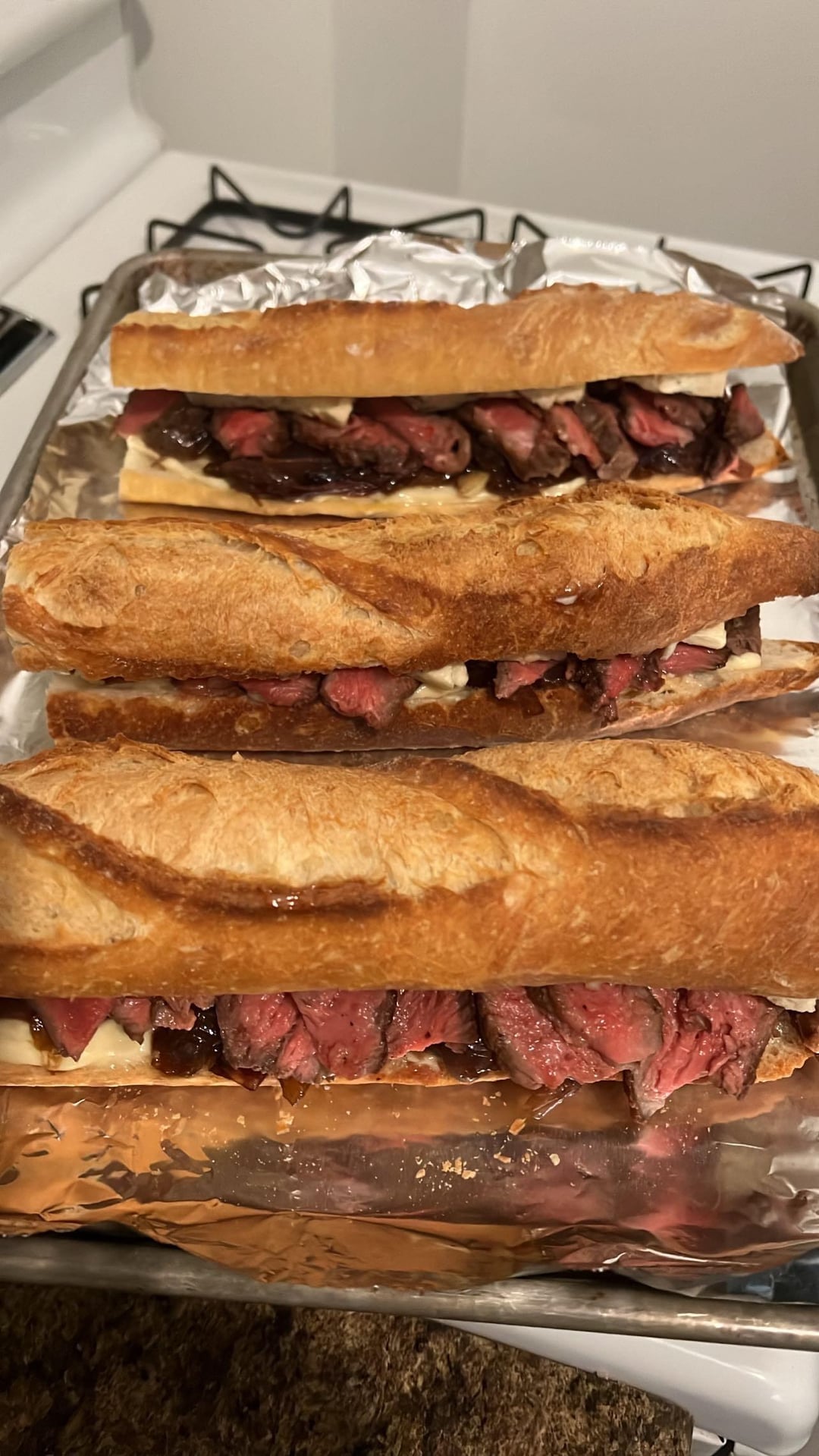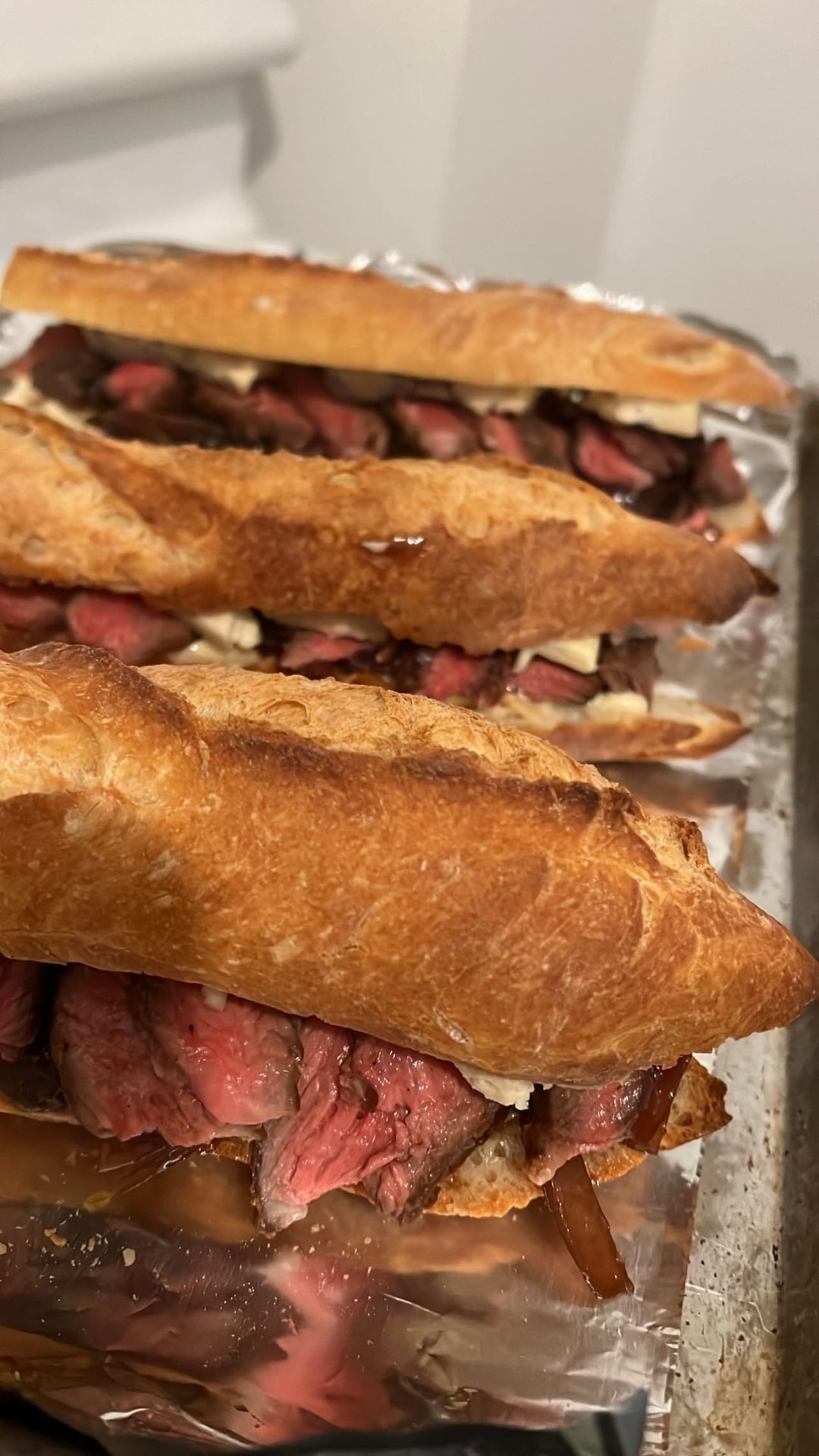 Ribeye baguette sandwich with sir Kensington avocado oil mayo, grand noir blue cheese, tiny bit of fermented peppercorns in one part of the sandwich for an extra zing, and caramelized onions cooked with honey, isigny spring butter, maldon salt and cilantro garlic balsamic