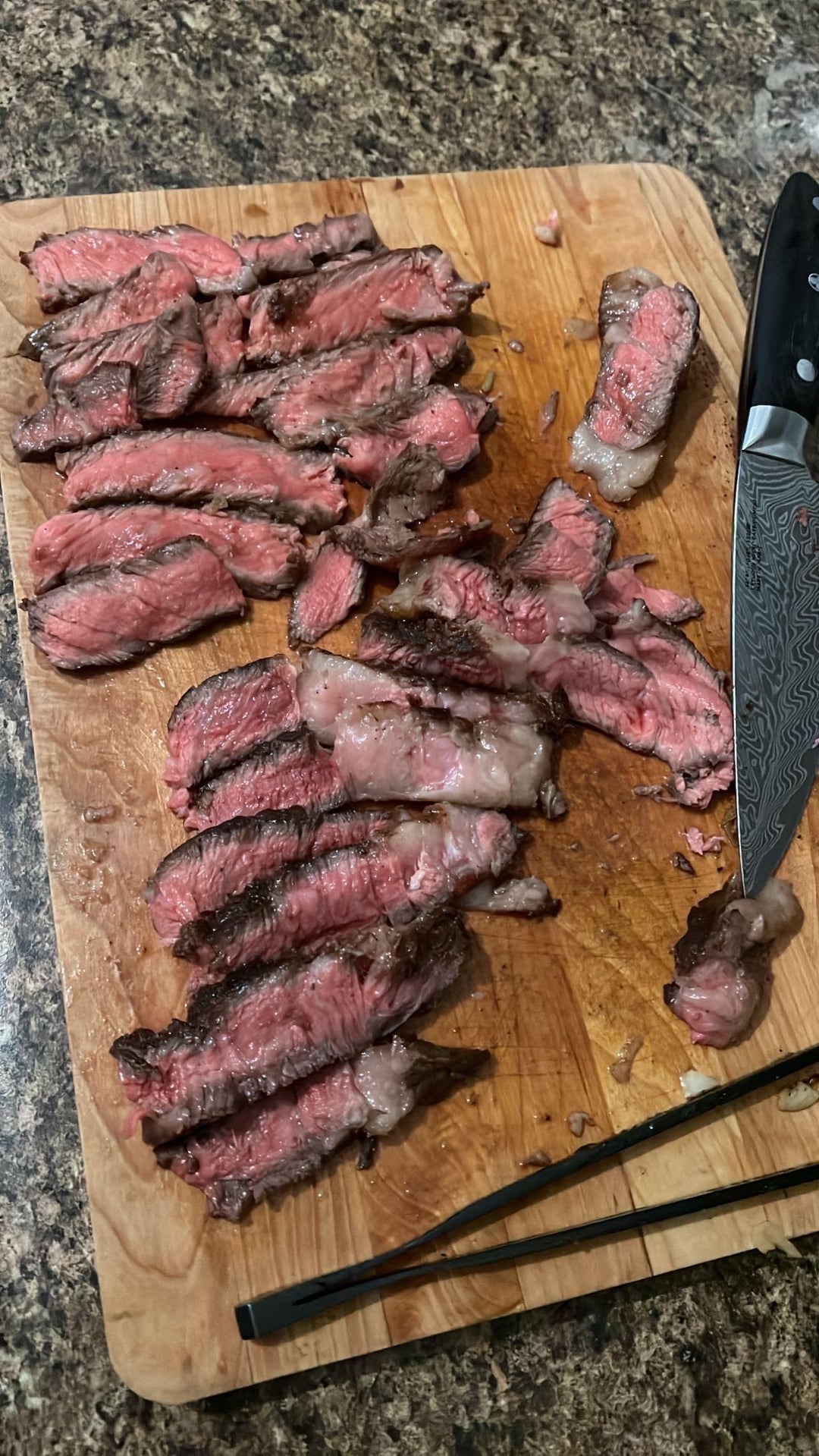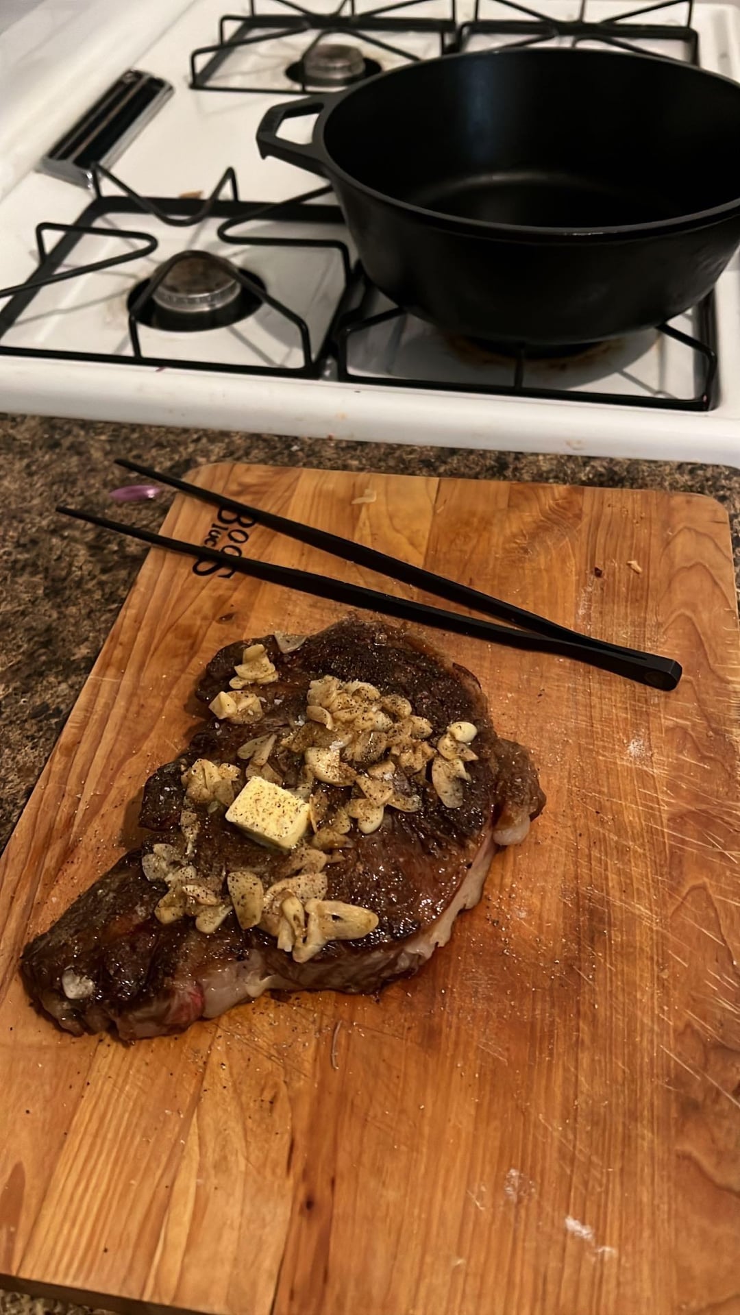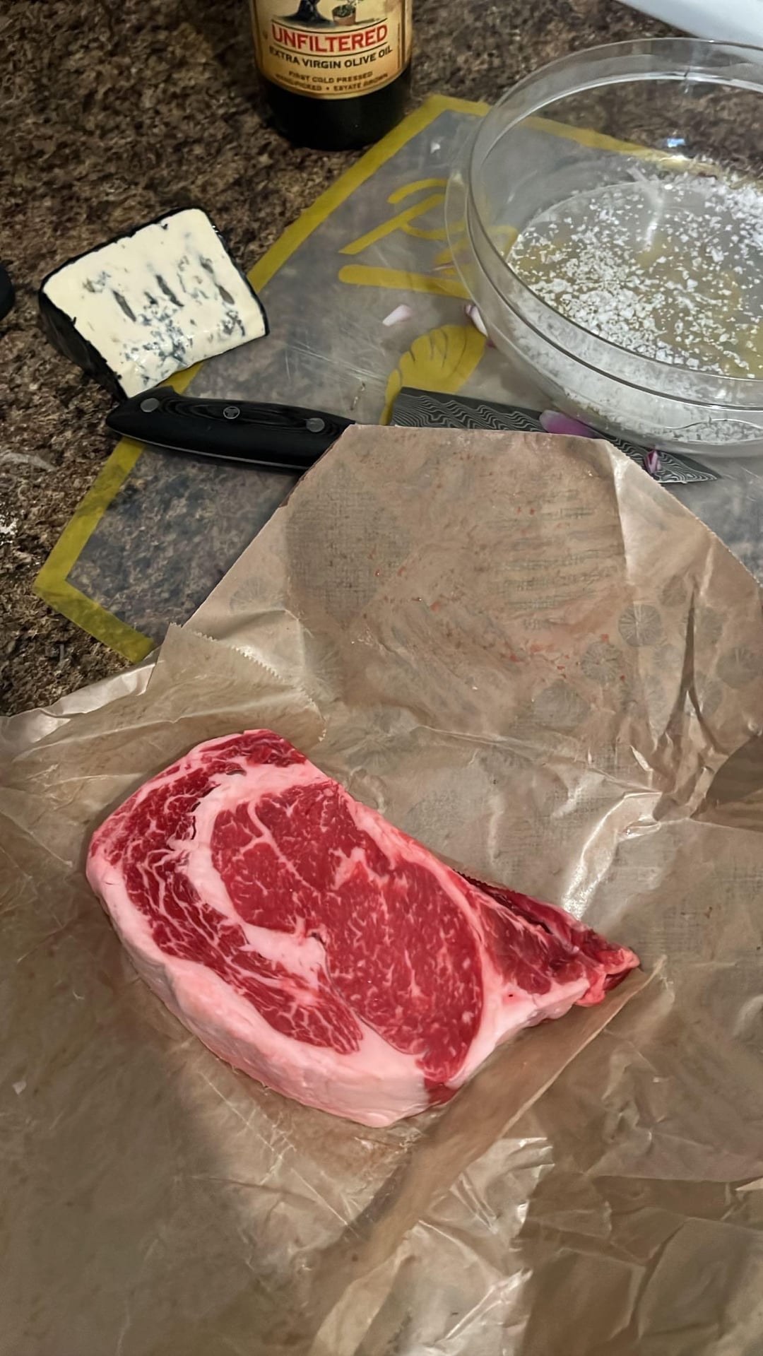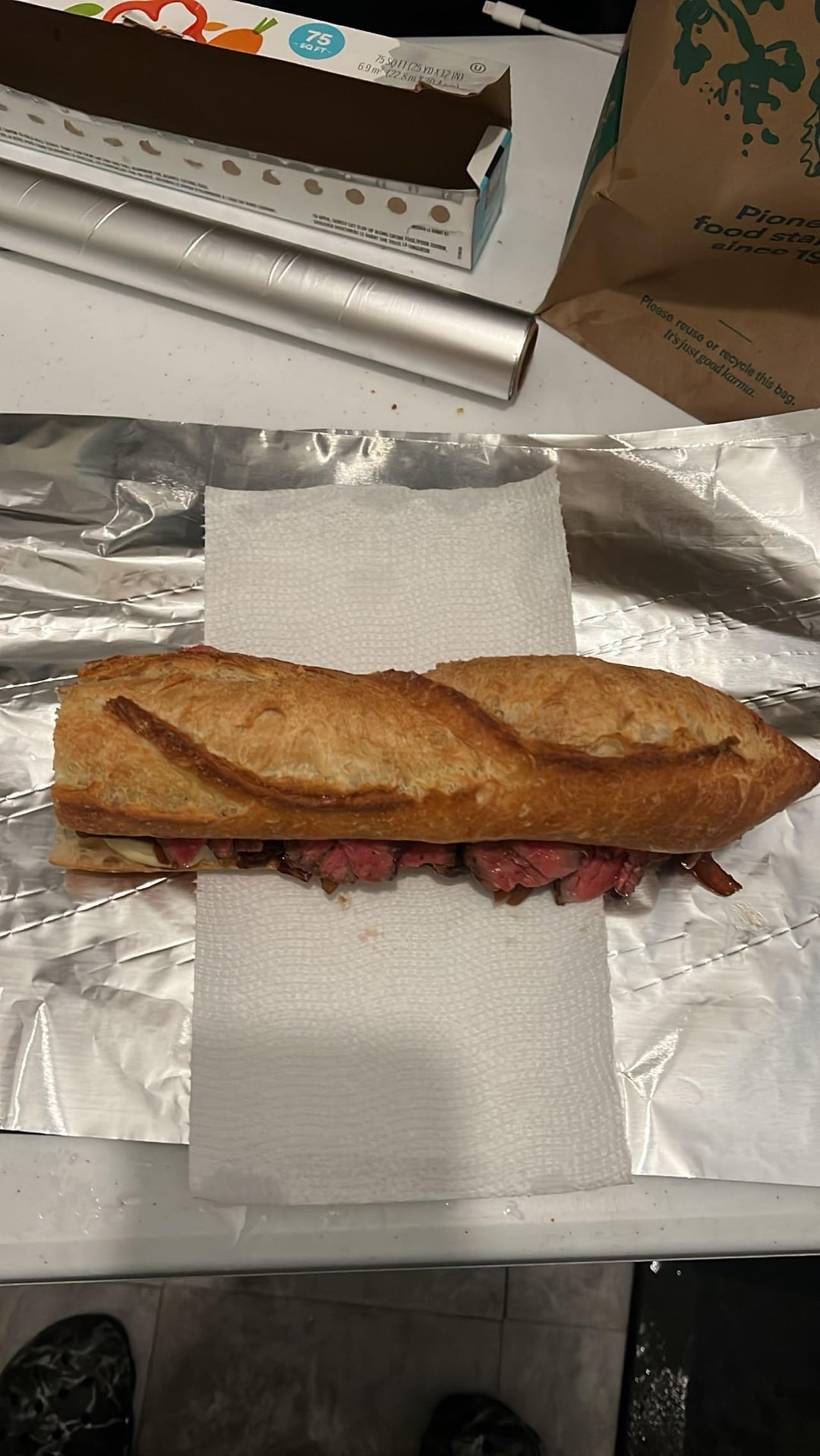 Ribeye baguette sandwich with sir Kensington avocado oil mayo, grand noir blue cheese, tiny bit of fermented peppercorns in one part of the sandwich for an extra zing, and caramelized onions cooked with honey, isigny spring butter, maldon salt and cilantro garlic balsamic