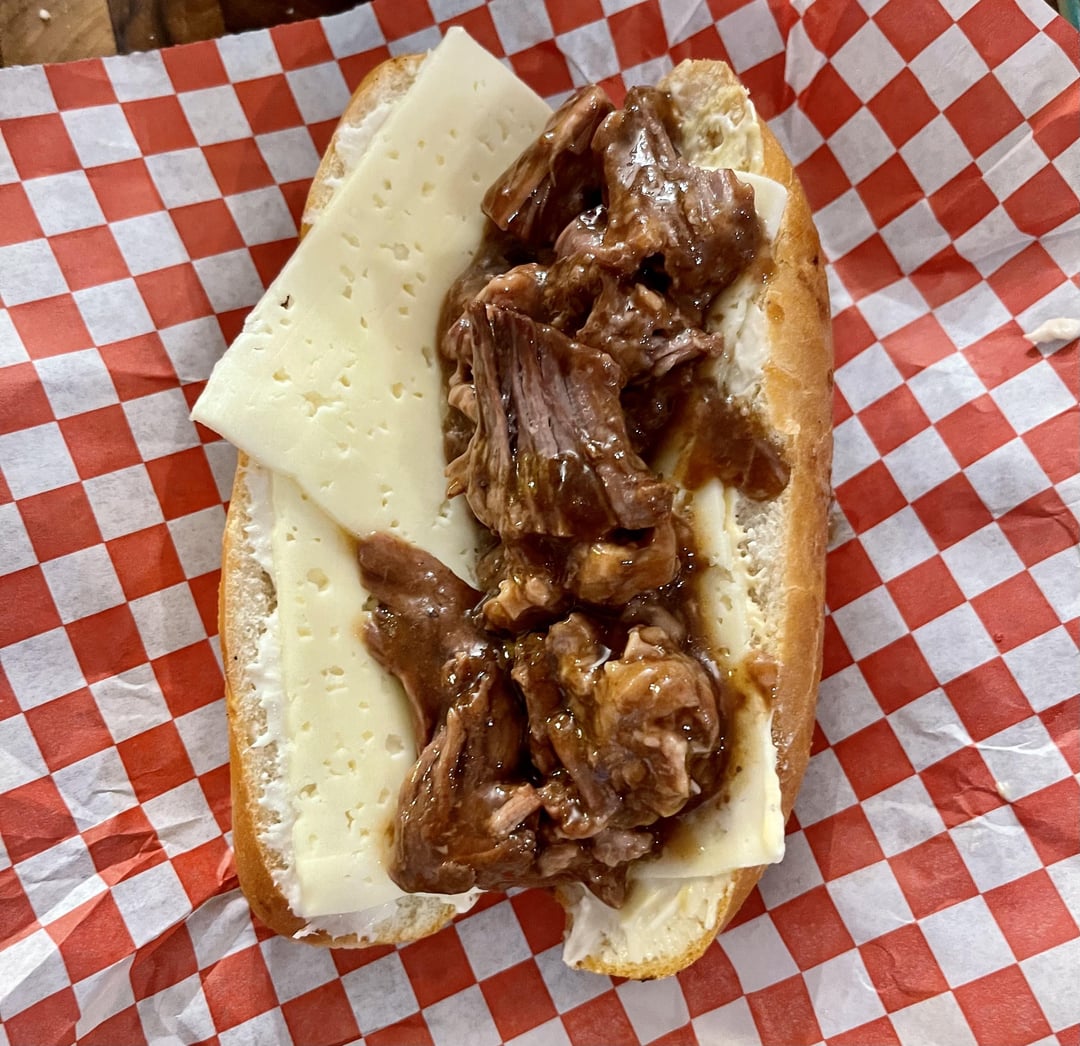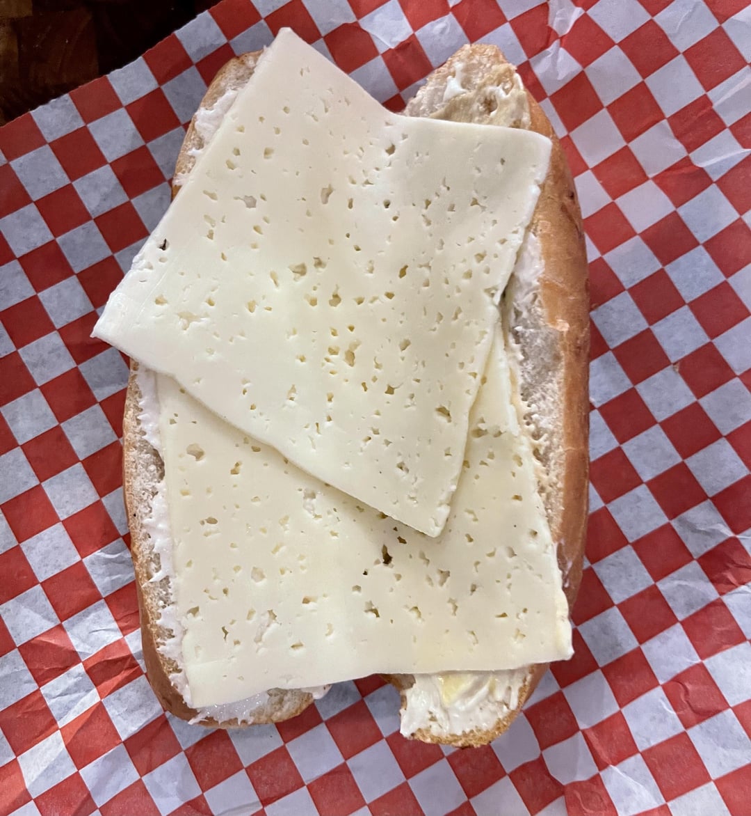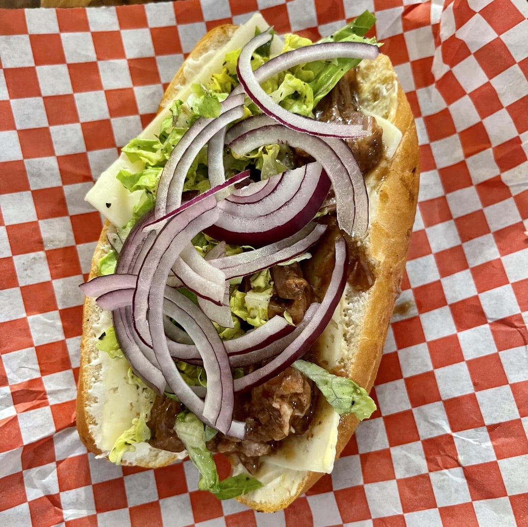 toasted bolillo roll, mayo, dijon, and creamed horseradish, havarti cheese, little gem lettuce tossed in red wine vinegar and seasoned with salt and pepper, thin sliced red onion