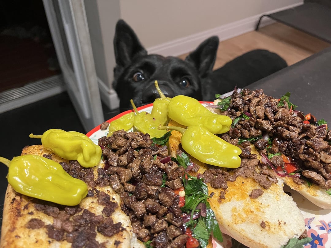 Tantuni. Popular street food of boiled ( I Instant Pot) and then fried meat ( ribeye is the best) with salt and sweet paprika from Mersin, Turkiye. Tomato, red onions and parsley seasoned with sumac for underneath dressing. Total cook time 15-20 minutes.
