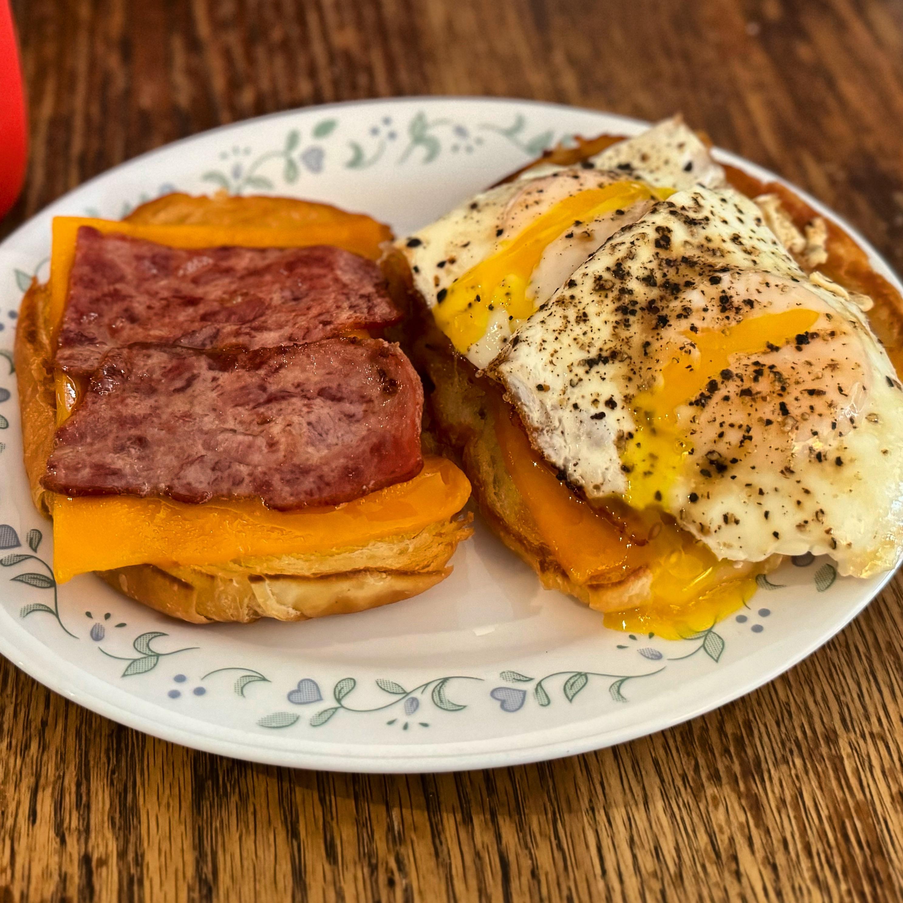 Two Over Easy Eggs, Turkey Bacon, and Cheddar Cheese on a Croissant