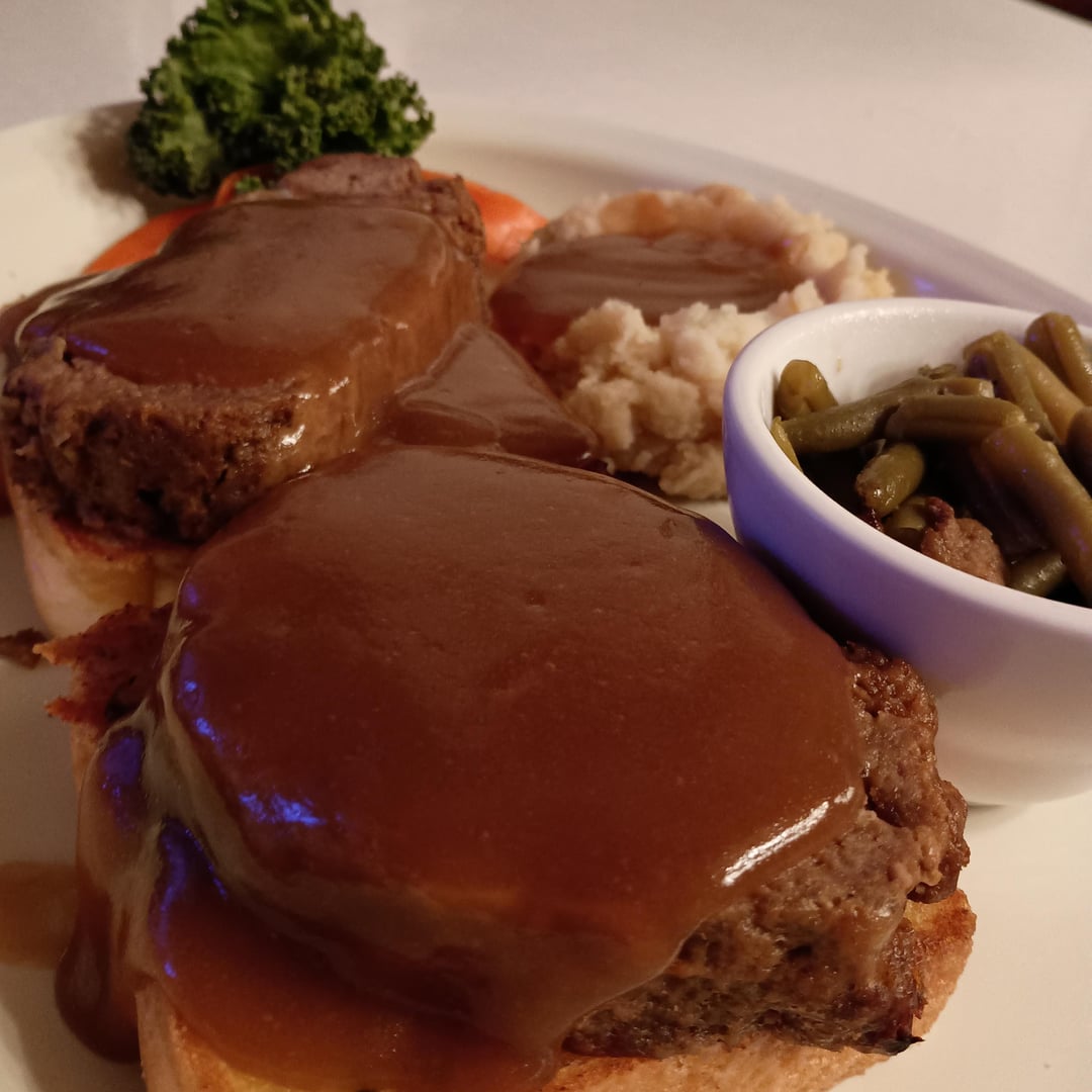 ‘ Dinner #1’ Open faced Meatloaf Sandwich on Garlic Toast with Brown Gravy. Side of Mashed Potatoes and Gravy, Dinner Veggies (Green Beans, Onions and Bacon)