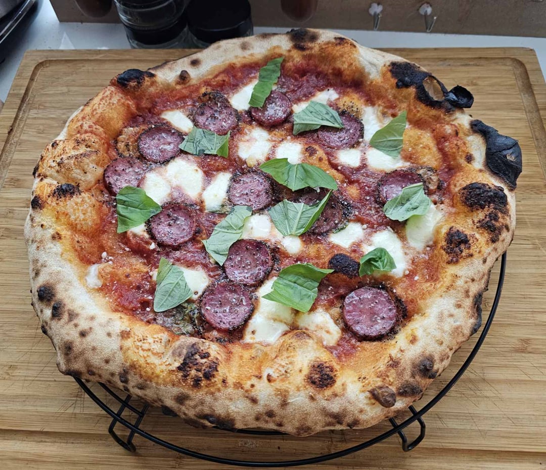 I don’t make pizzas too often, in an attempt to reduce my carbohydrates. However, I gave it a go last week with a 72% hydration dough (75% Caputo Cuoco, 25% Manitoba) with 4 days of cold fermentation. Same dough and sauce for both pizzas (simple Neapolitan sauce).
