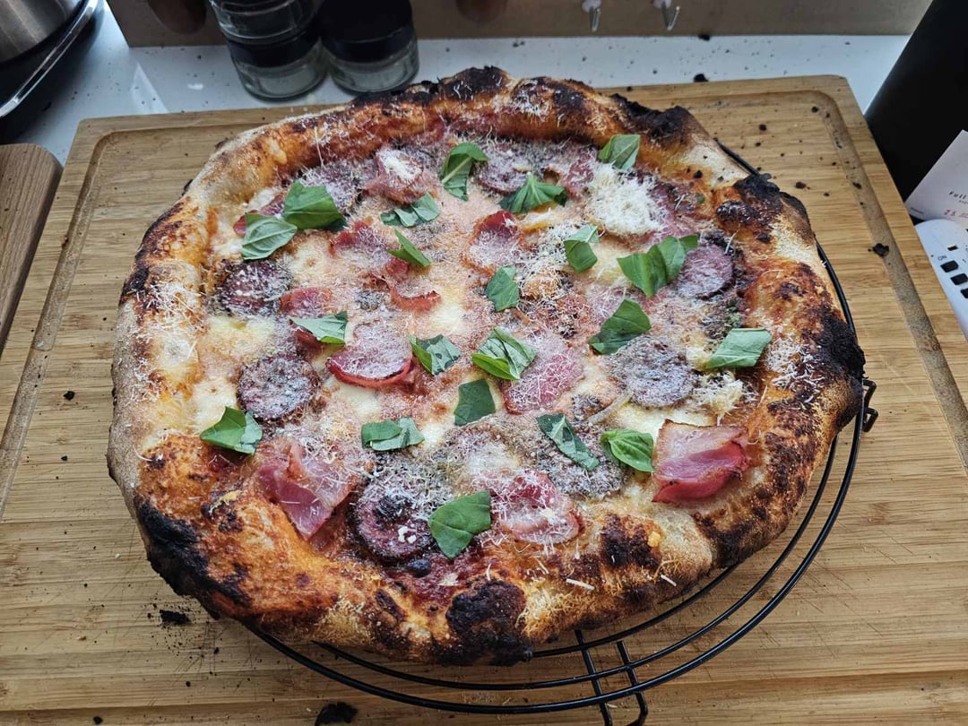 I also have a Biscotto Saputo stone and I’m still kinda calibrating it. Even though it’s way more forgiving than the cordite stone included with the Ooni oven, you have to keep an eye on it. It needs a bit more time to get up to temp, but it has to cool down a bit before putting the second pizza in, to account for the longer baking time.