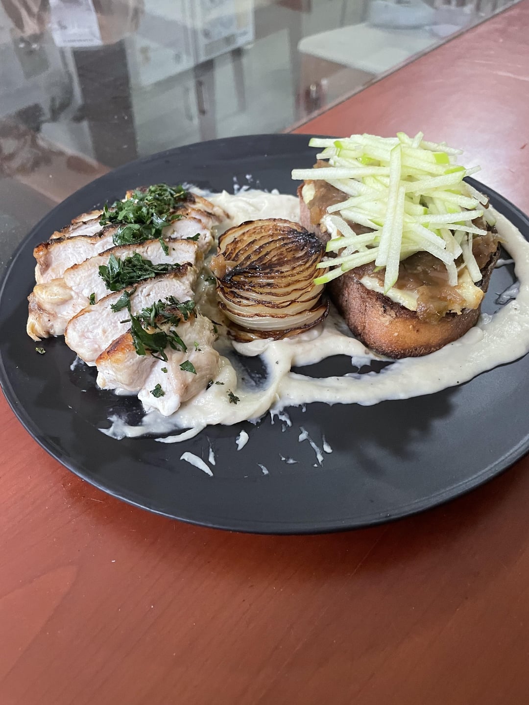 Crispy skin chicken, parsnip cauliflower brown butter purée, brie toast with apple onion jam and fresh apple