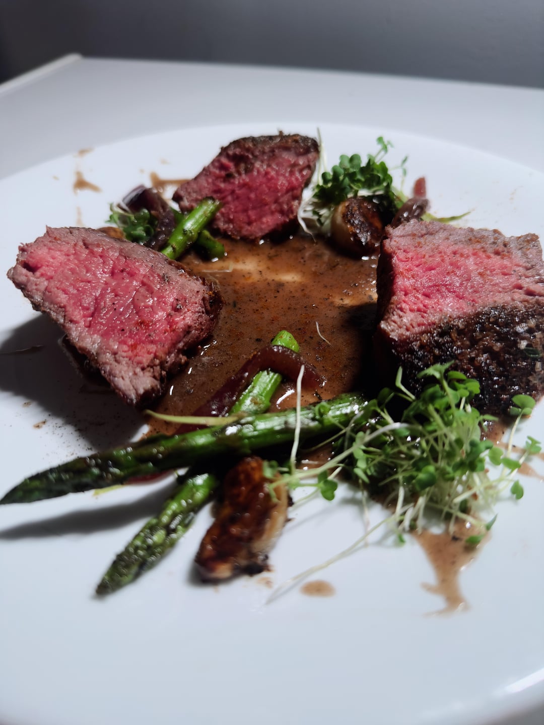 i get what your going for. maybe a little over ooked. Also typically those splattering style aka “roadkill” plating shouldn’t be done with something that would resemble my line cooks boxers after a night out lol. beetroot puree. butternut puree, parsnip? cranberry? dont need micro salad. a few sprigs would do. maybe use something more seasonal. squash or roots. asparagus is more of a spring fling. Just minor critics homie. otherwise i would smash that.
