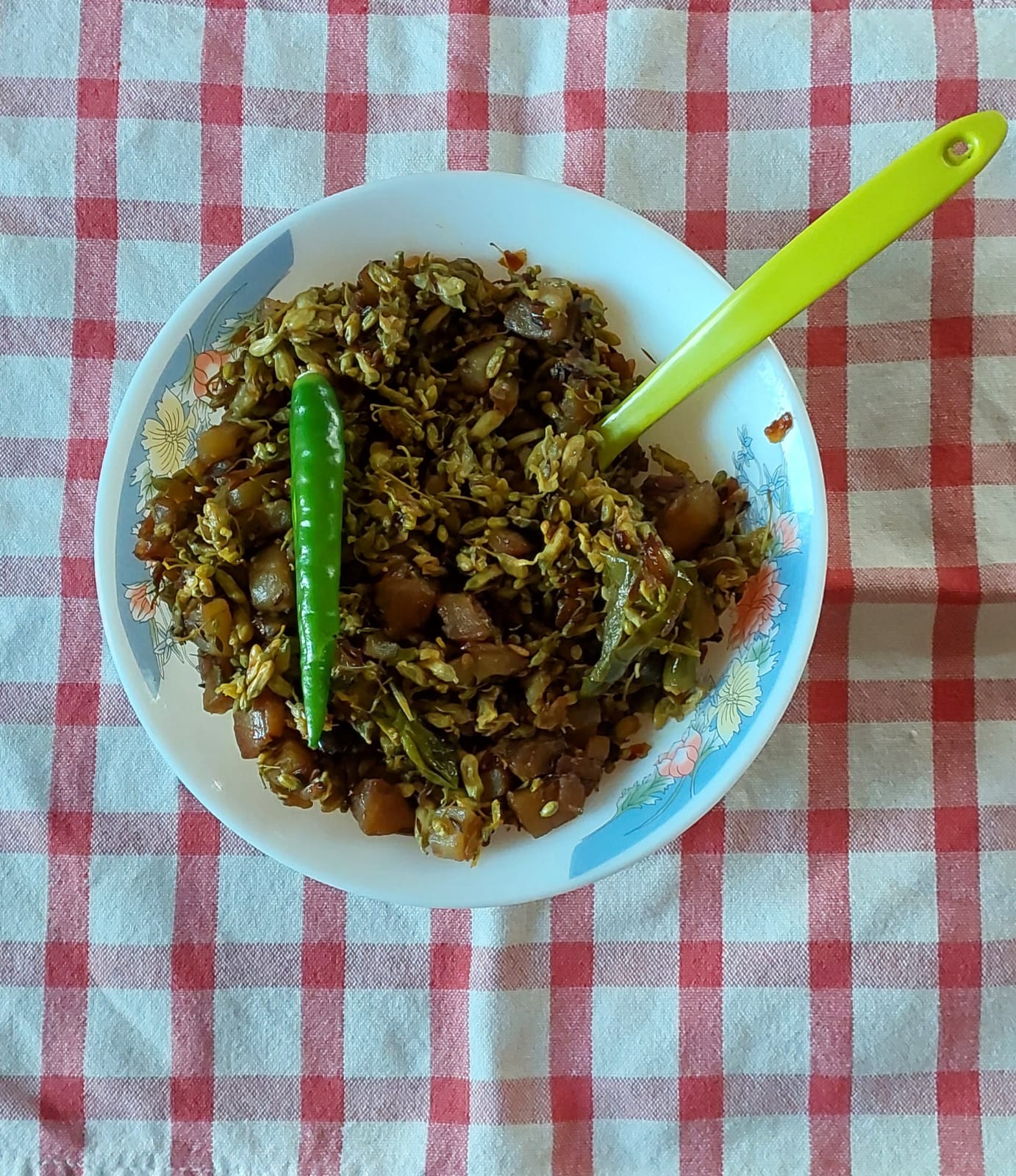 1. Drumstick flowers (Moringa) +250 gm. 2. Potato 1 large cut into small cubes 3. Mustard seeds 1 tsp 4. Turmeric powder 1/2 tsp 5. Onion 1 large chopped 6. Green chili 2-3 slit 7. Garlic clove 5-6 crushed 8. Salt as required 9. Mustard Oil 4 tbsp