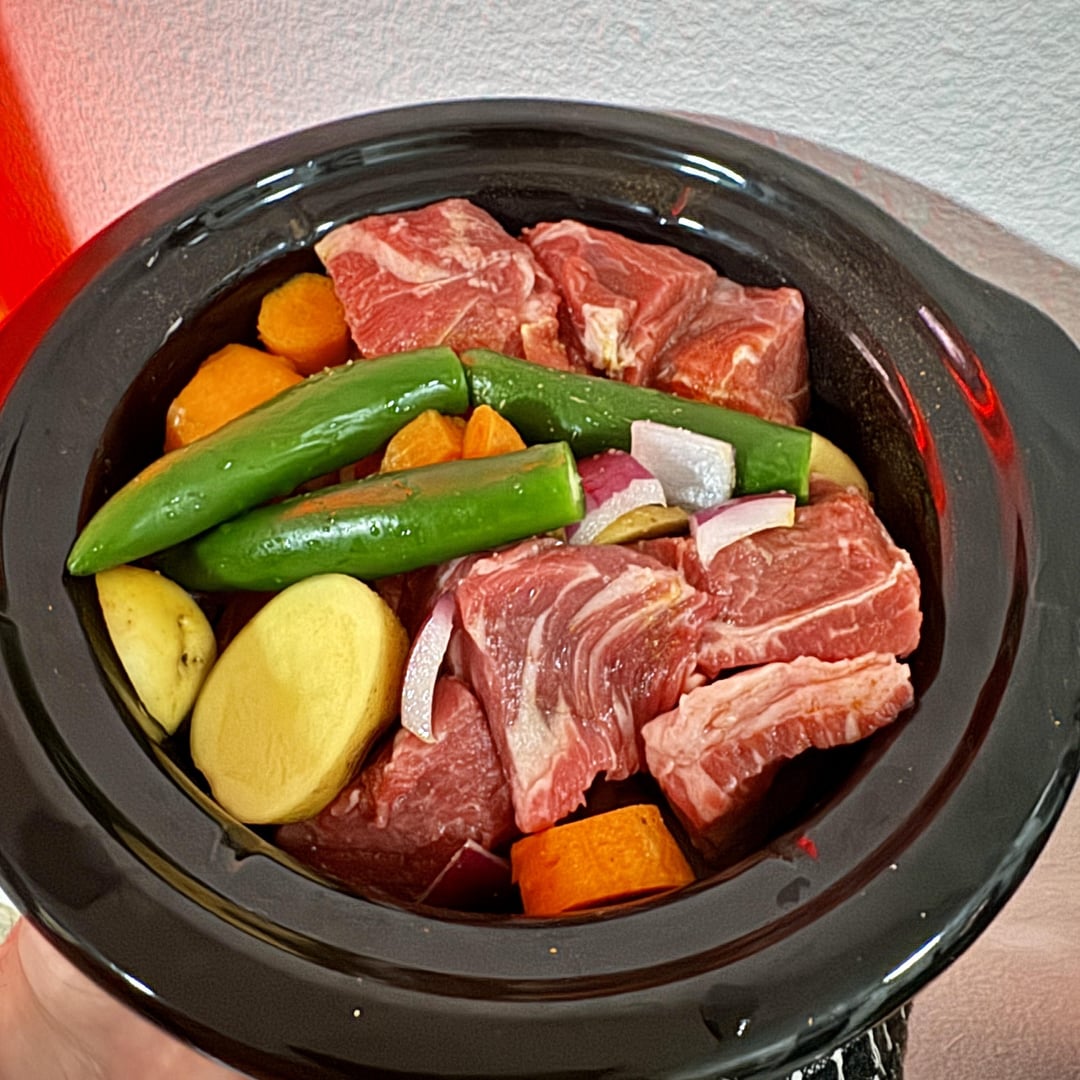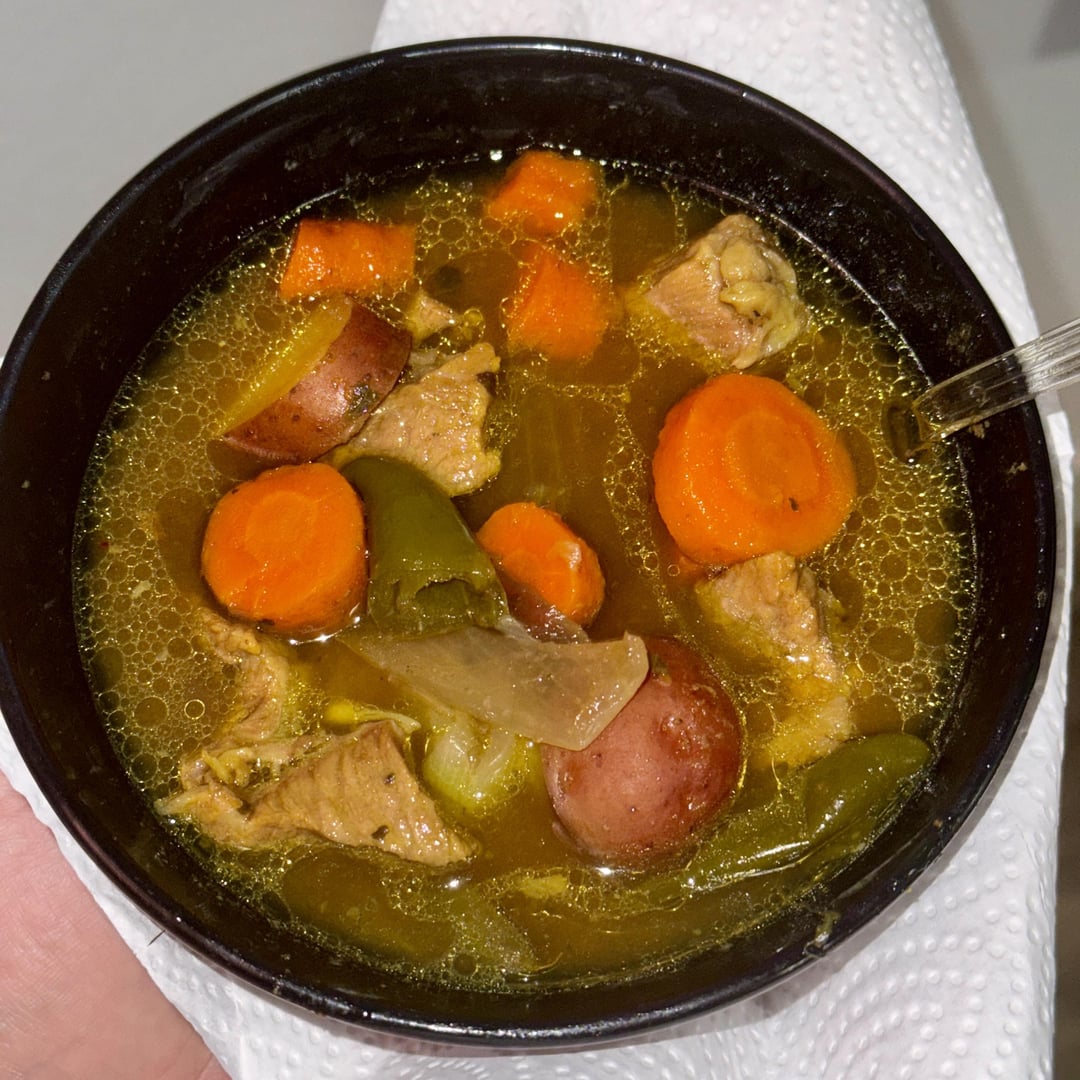 1 pound of cut up chuck roast 🥩. 2 carrots 🥕. 4 mini potatoes 🥔. 2 Serrano peppers 🌶️. 4 green tomatillos. 1/2 onion 🧅. 2 garlic 🧄. Salt, pepper, turmeric, saffron, water.