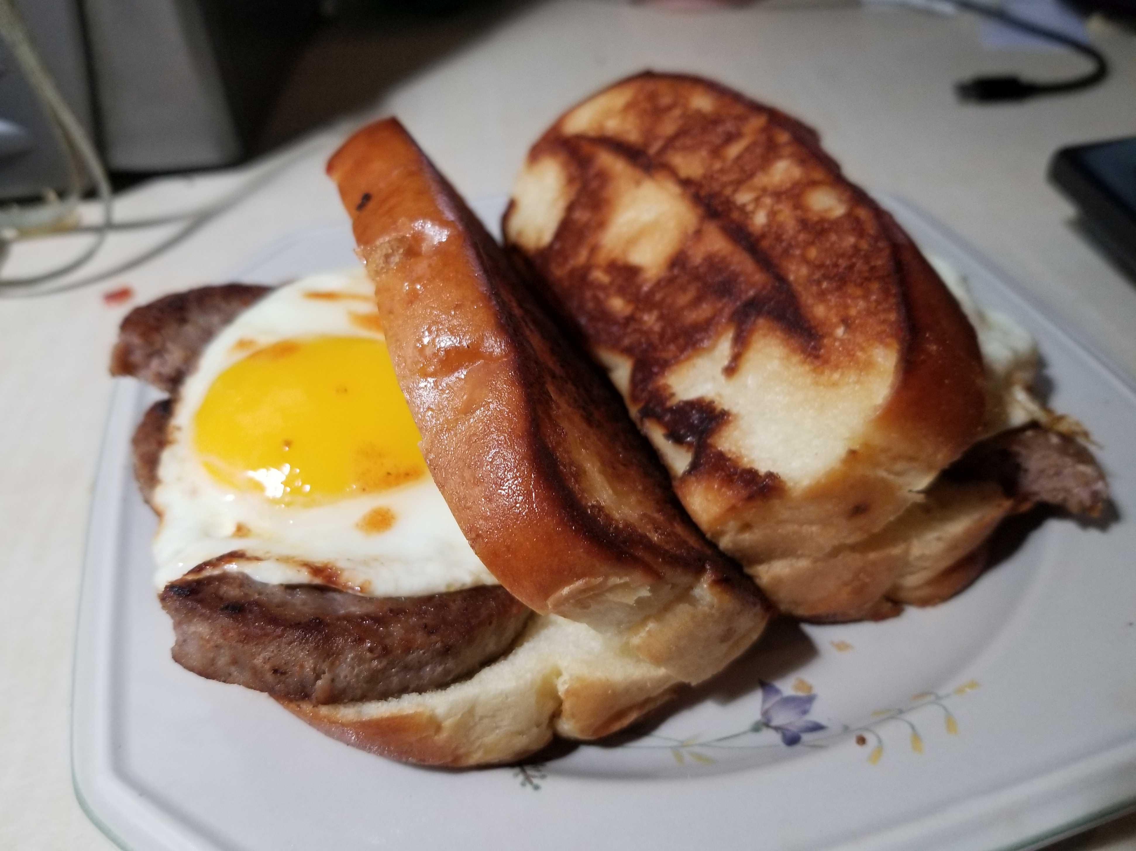 Fresh sausage patties and jumbo sunny-up egg on buttered and grilled NE Style Brioche Hot Dog Buns. This is why I’m not vegan.