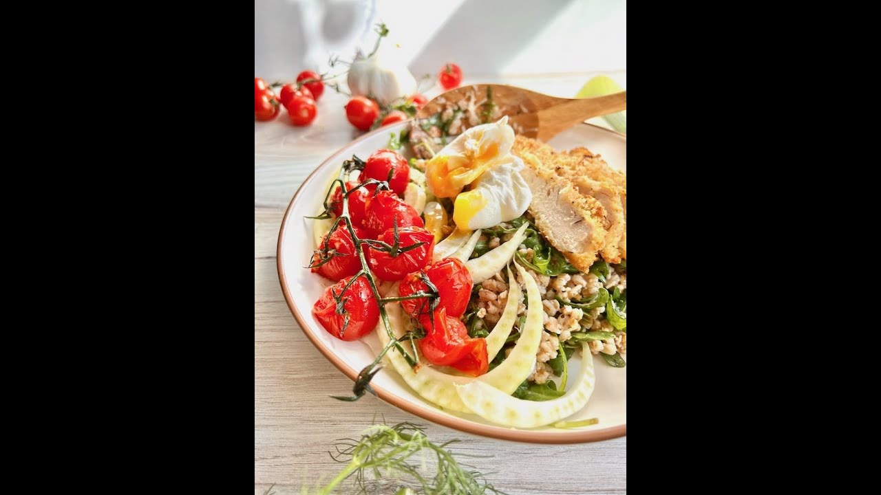This Italian Farro Salad with Chicken brings the flavors of cacio e pepe to a farro bowl that includes blistered cherry tomatoes on the vine, fresh fennel, air-fried chicken, and a poached egg. This salad is perfect for warmer weather, but really we love it so much that we eat it year-round.