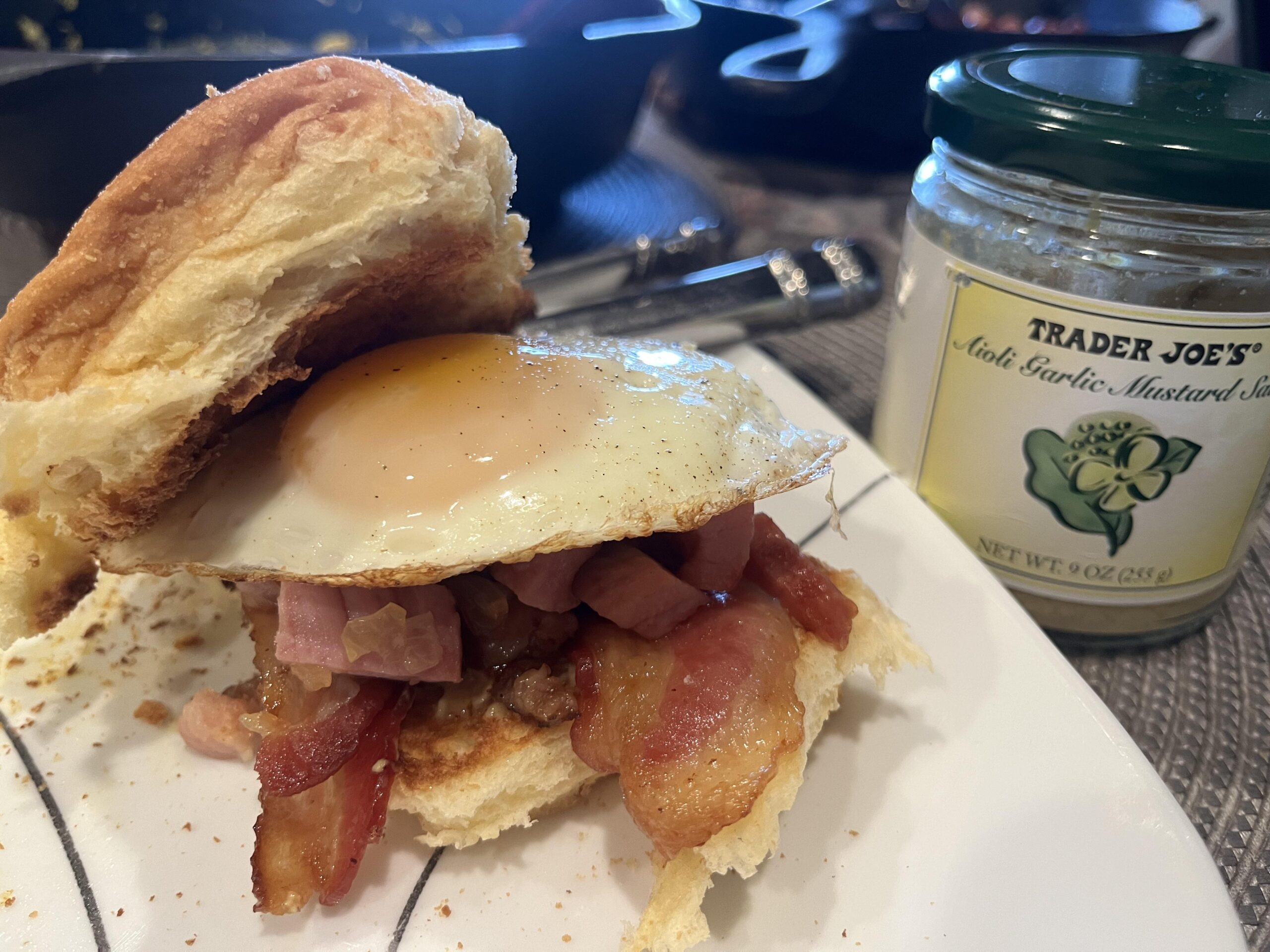 Bacon, ham, Trader Joe’s garlic aioli mustard on toasted pan deal bread, traditional Filipino breakfast bread, with an over easy egg 🥚by Whatsuptodaytomorrow Write A CommentYou must be logged in to post a comment.
