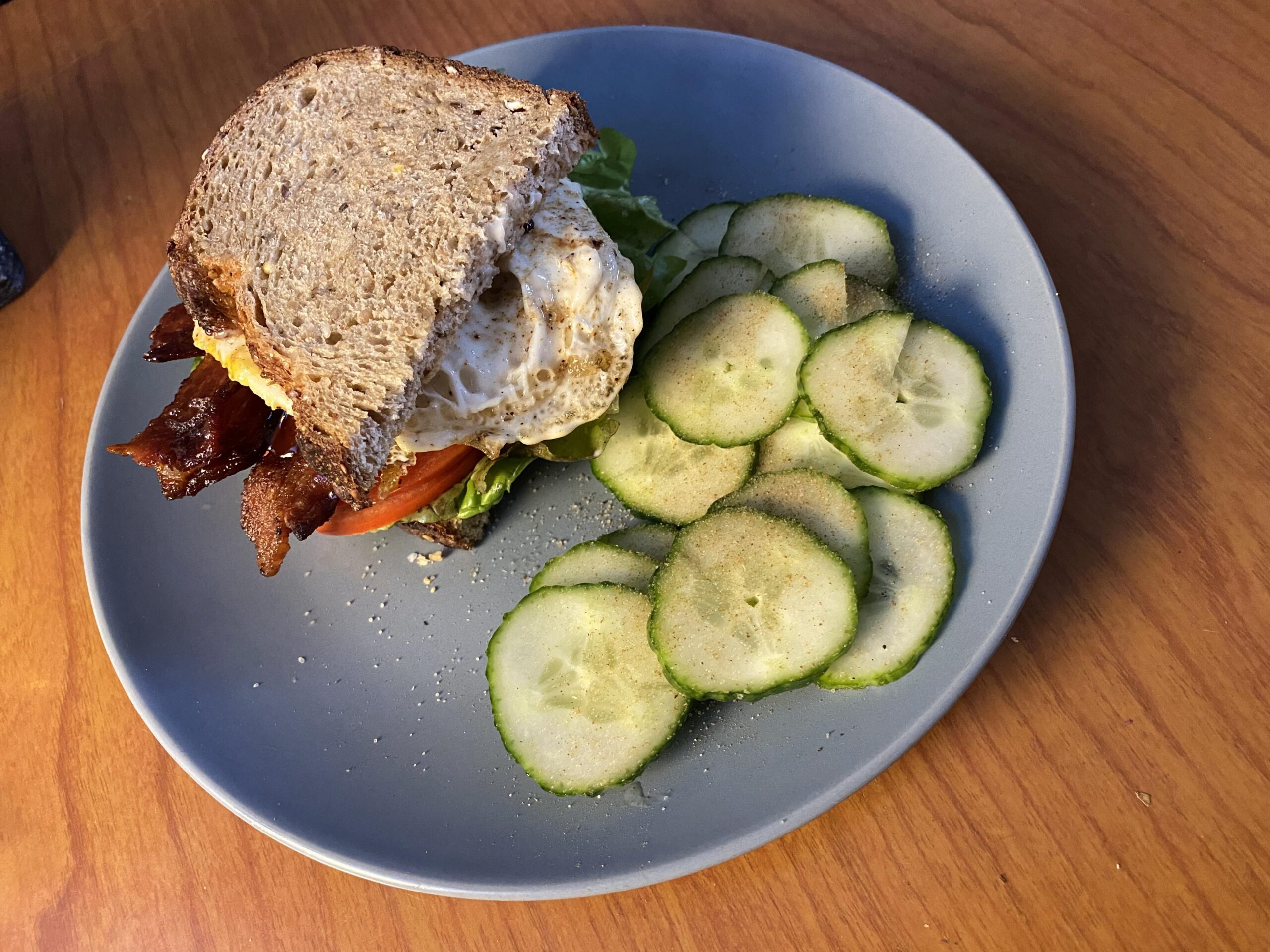 Bacon, egg, lettuce, tomato, mayo, jalapeño honey, Morton’s Season-All, black pepper, and cukes with celery salt on the side.