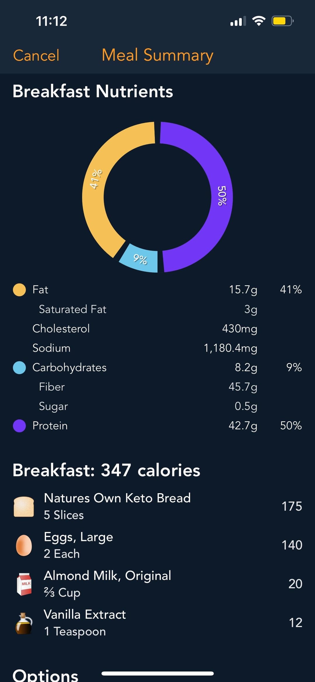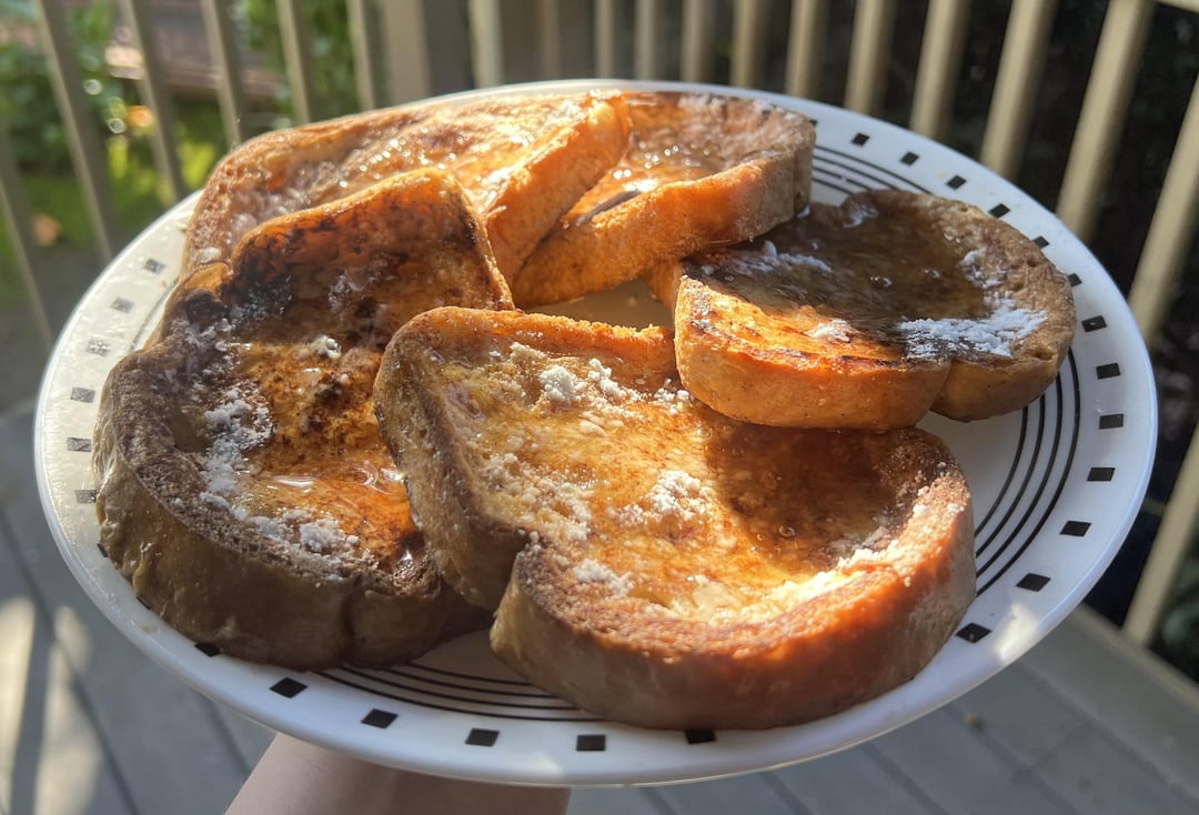 Followed the steps in this [recipe](https://www.allrecipes.com/recipe/7016/french-toast-i/) except substituted the bread for Nature’s Life Keto bread, the milk for almond milk, and the butter in the pan for PAM spray oil.