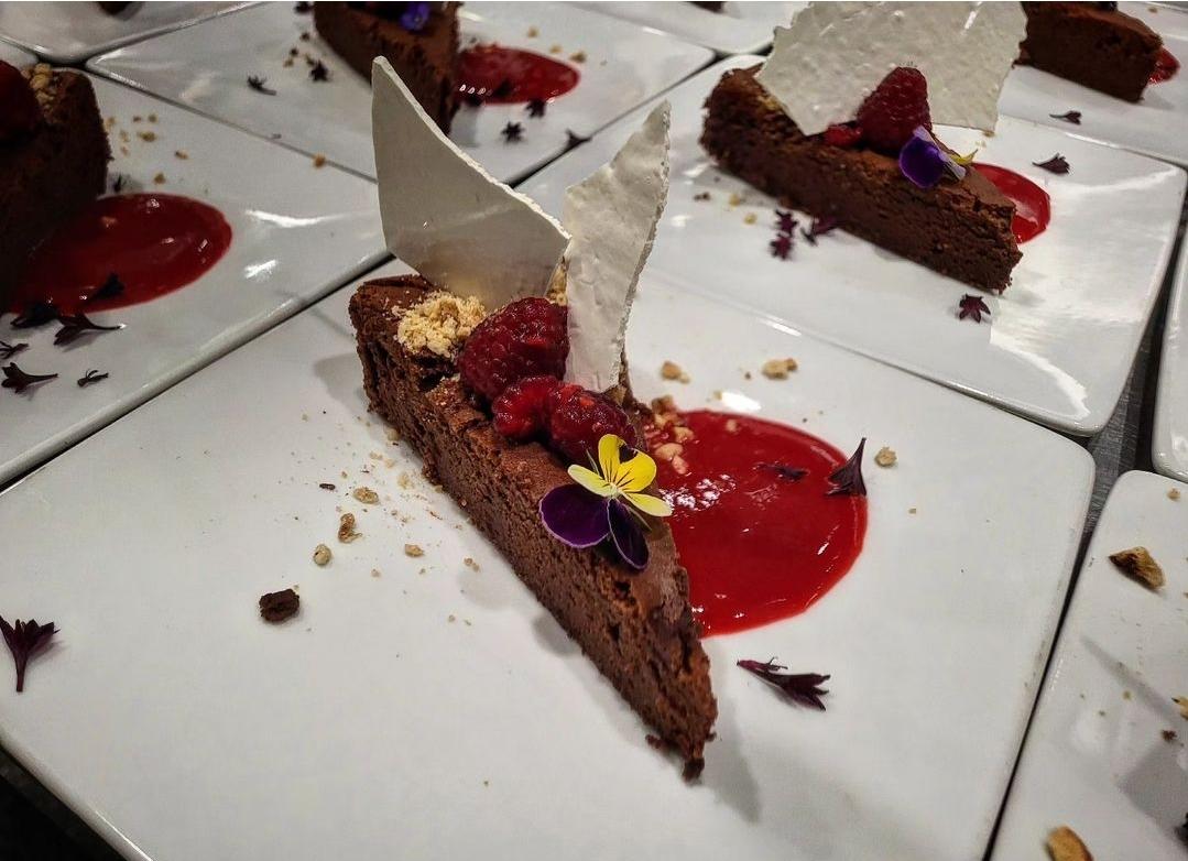 Flourless chocolate cake with raspberry coulis, candied hazelnut, meringue shards, and liquor soaked raspberries