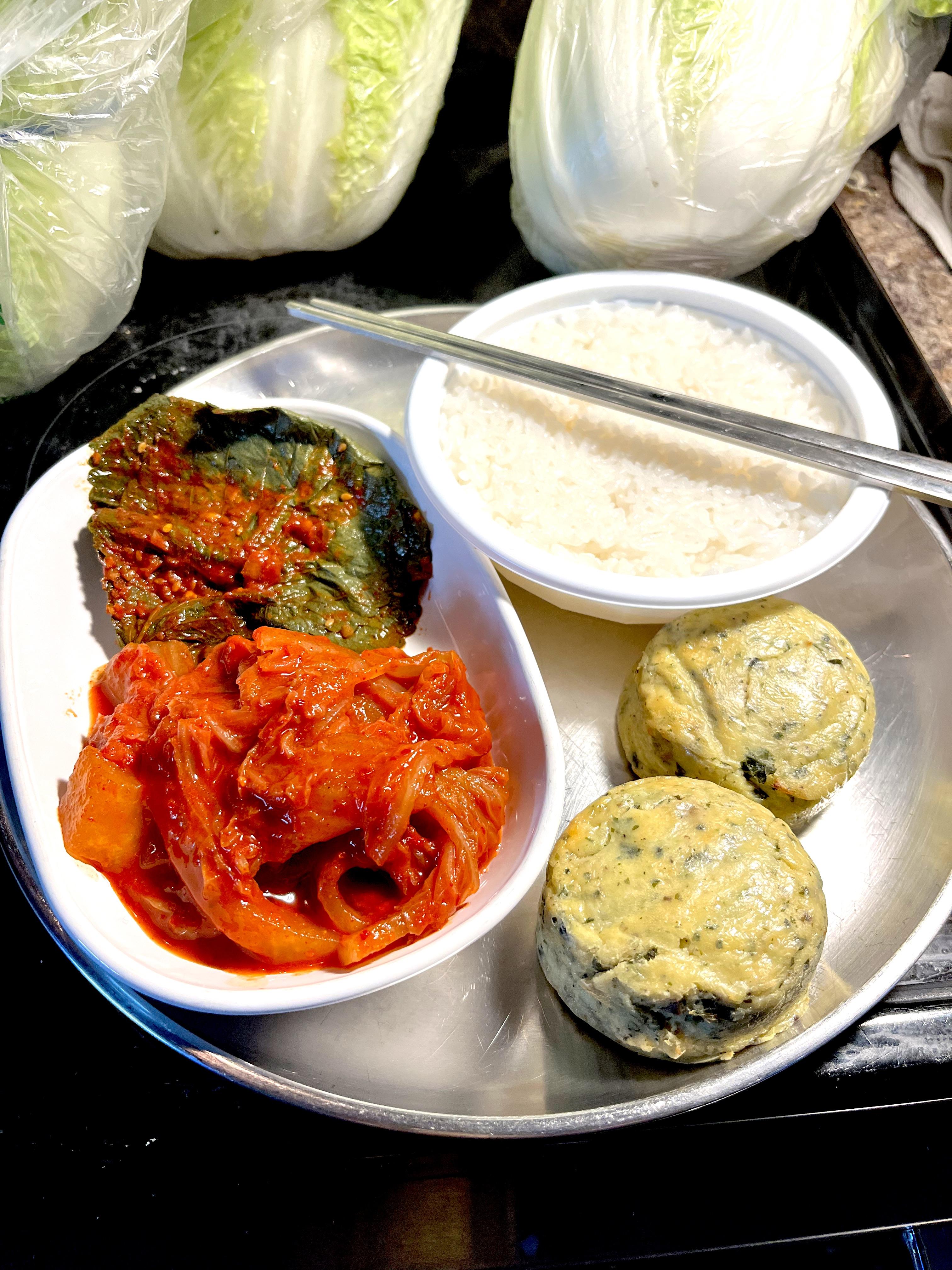 Its kimchi making day again and I just grabbed some spinach and kale egg bites from Starbucks and added a microwave sticky rice and my homemade banchan, kimchi and kkaennip kimchi. I have 9 heads of cabbage to deal with and this is my fast food breakfast 😁