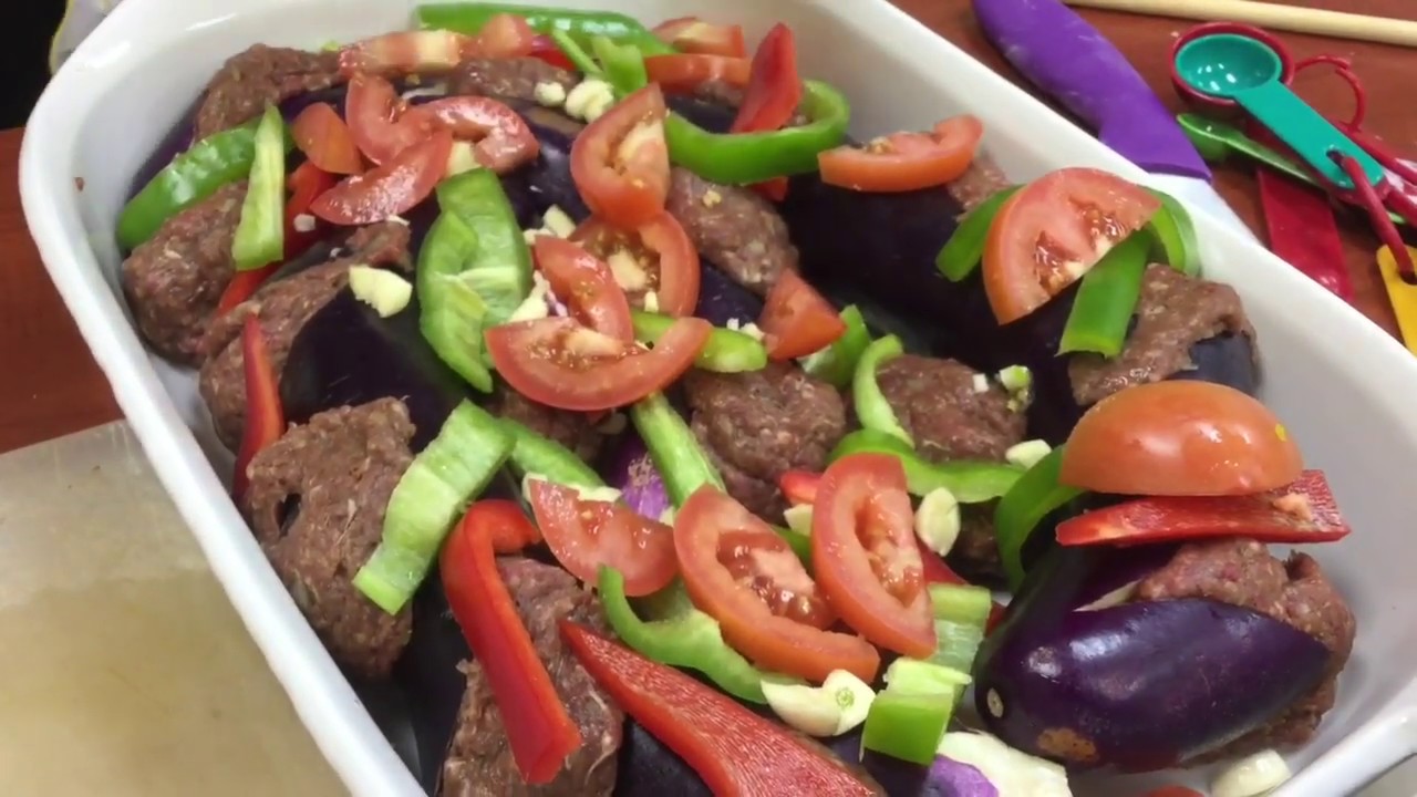 Peel eggplants in stripes (pajama style peeling) and keep them in salty water for several minutes. Meanwhile, in a bowl combine ground beef and grated onions. Season with salt, pepper and dried thyme. Form beef patties. Take the eggplants out of the salty water. Pat them dry and slice them 1/2 “ thick halfway making sure not to cut all the way- meaning the slices should still be attached to each other. Place the beef patties between the eggplant slices. Carefully transfer stuffed eggplants that resemble the half moon shape into a baking dish. Add grated tomatoes on the stuffed eggplants. In a separate bowl, combine well the tomato paste and water. Add salt and pour over the stuffed eggplants. Also add peppers and cloves of garlic to the baking dish. Bake until the eggplants are ready. (about 400 F for 40 min)