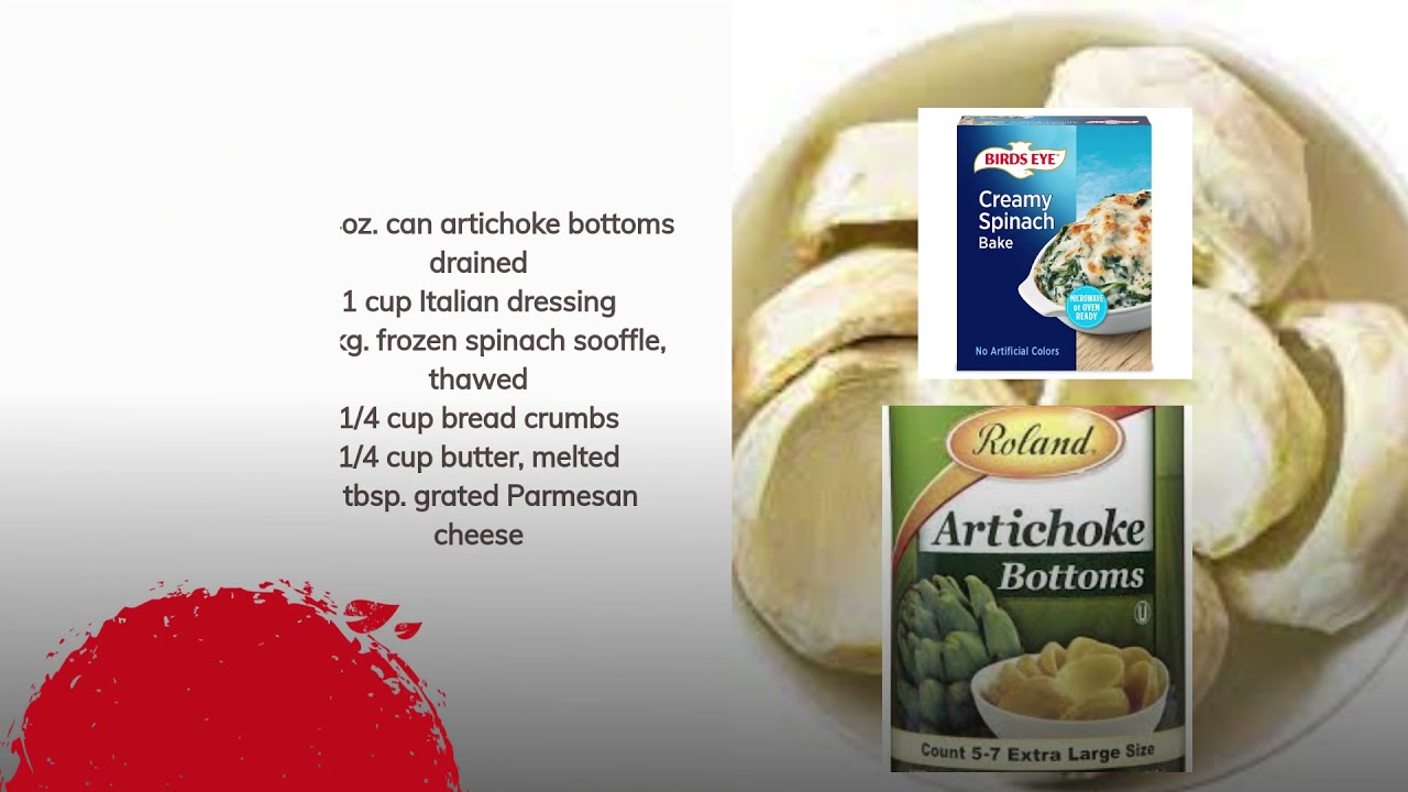 Marinate artichoke bottoms (you can buy them in a can) in salad dressing for several hours or overnight, drain Stuff with spinach with spinach. Mix the rest of the ingredients and layer over artichokes. Bake 350 degrees for 25 minutes. Write A CommentYou must be logged in to post a comment.