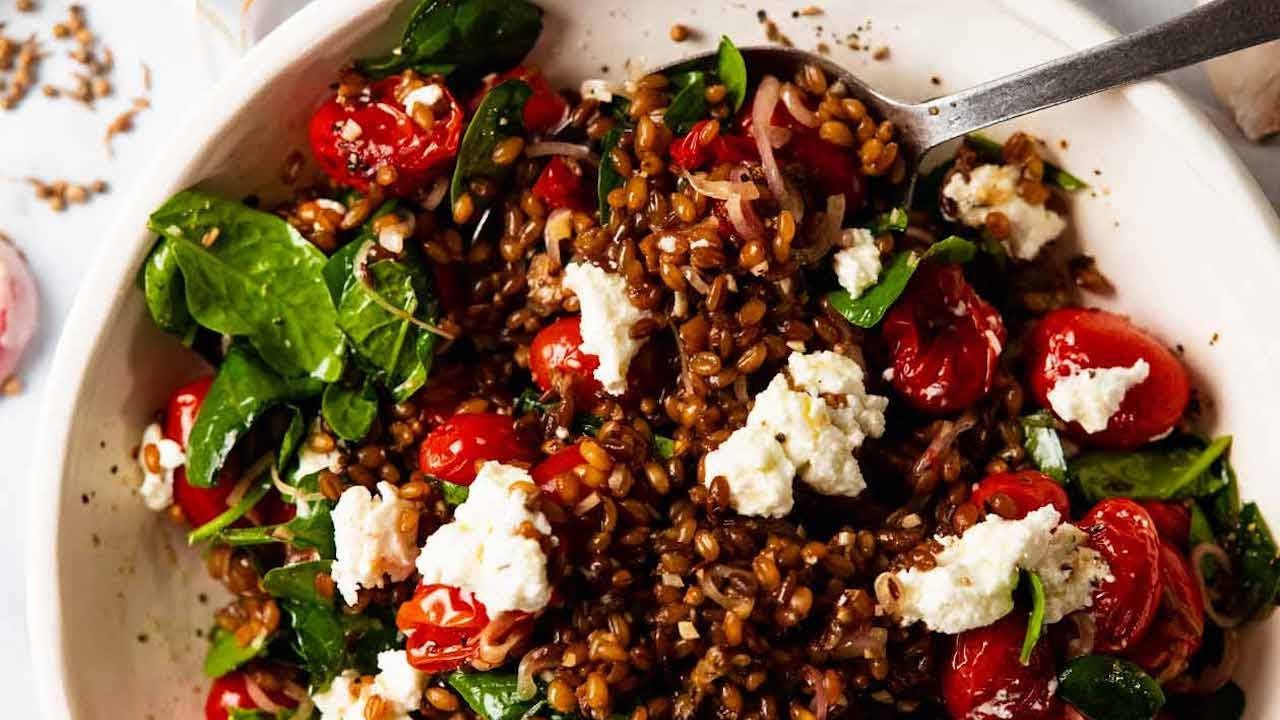 Farro is so much more interesting than pasta or rice! This farro salad is a stellar mix of flavour and texture: nutty farro, bursty tomatoes, spinach bits and smeary goats cheese or feta, doused in a hot garlic Sizzled Dressing with pops of coriander and cumin.