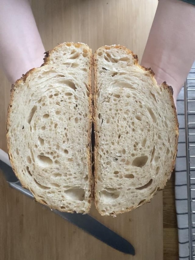 Technique: – mix everything all at once – after 20 mins, start strech and folds every 30 mins 4 times. – let it rest until it had doubled in size (100%) – (I forgot to put my loaf in the fridge to make it ferment slower, I was aiming for a 50% increase but oh well) – Shape, bench rest 30 mins then final shape – put in banneton overnight, ~ 12h, then bake