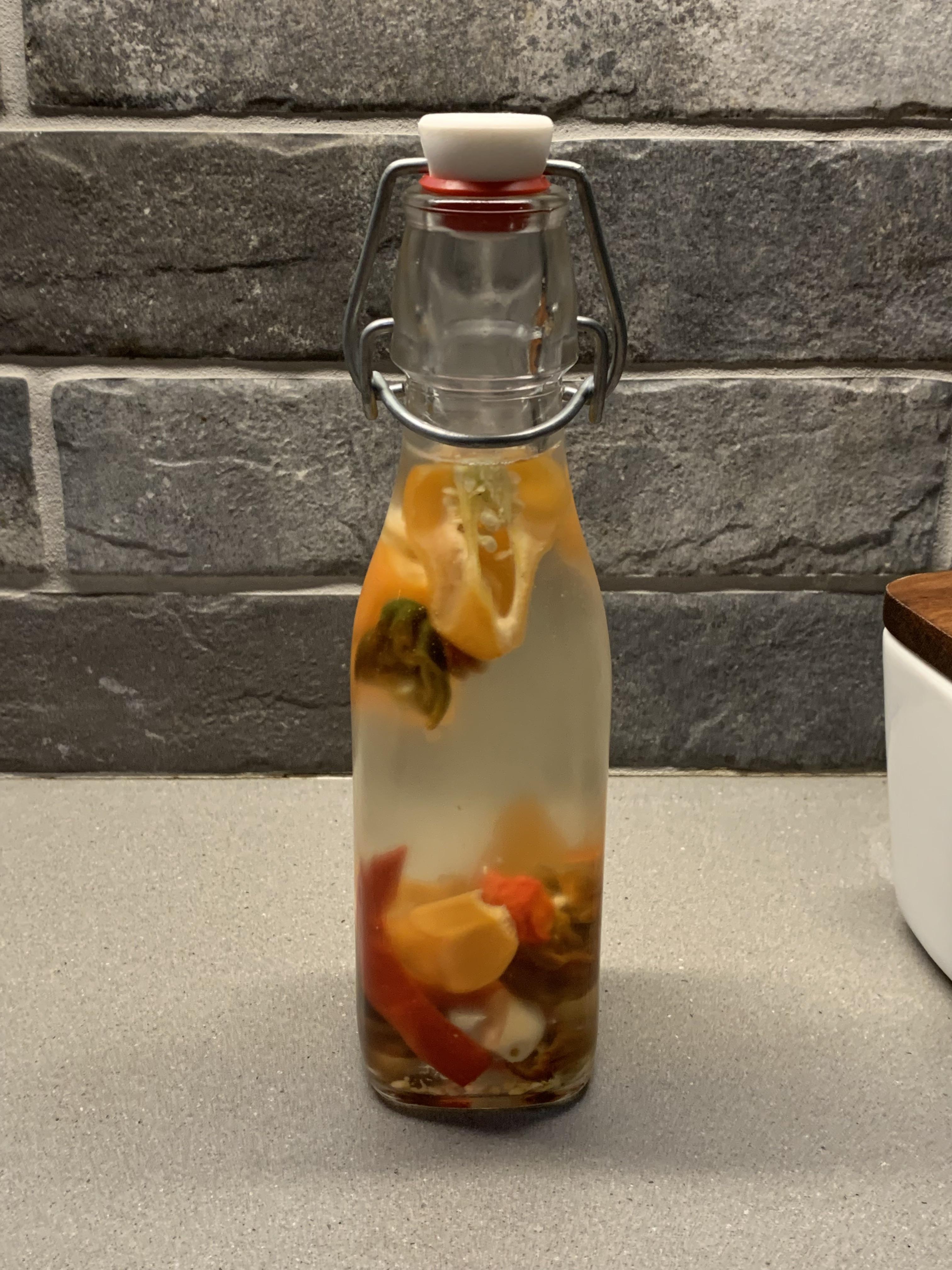 Pepper vinegar is the way to go. This is 100% vinegar with a few habs, choc habs, ghost, clove of garlic and a big pinch of kosher salt. Two weeks in the fridge and it brightens up and accentuates almost anything you can eat. Simple and easy to control the heat.
