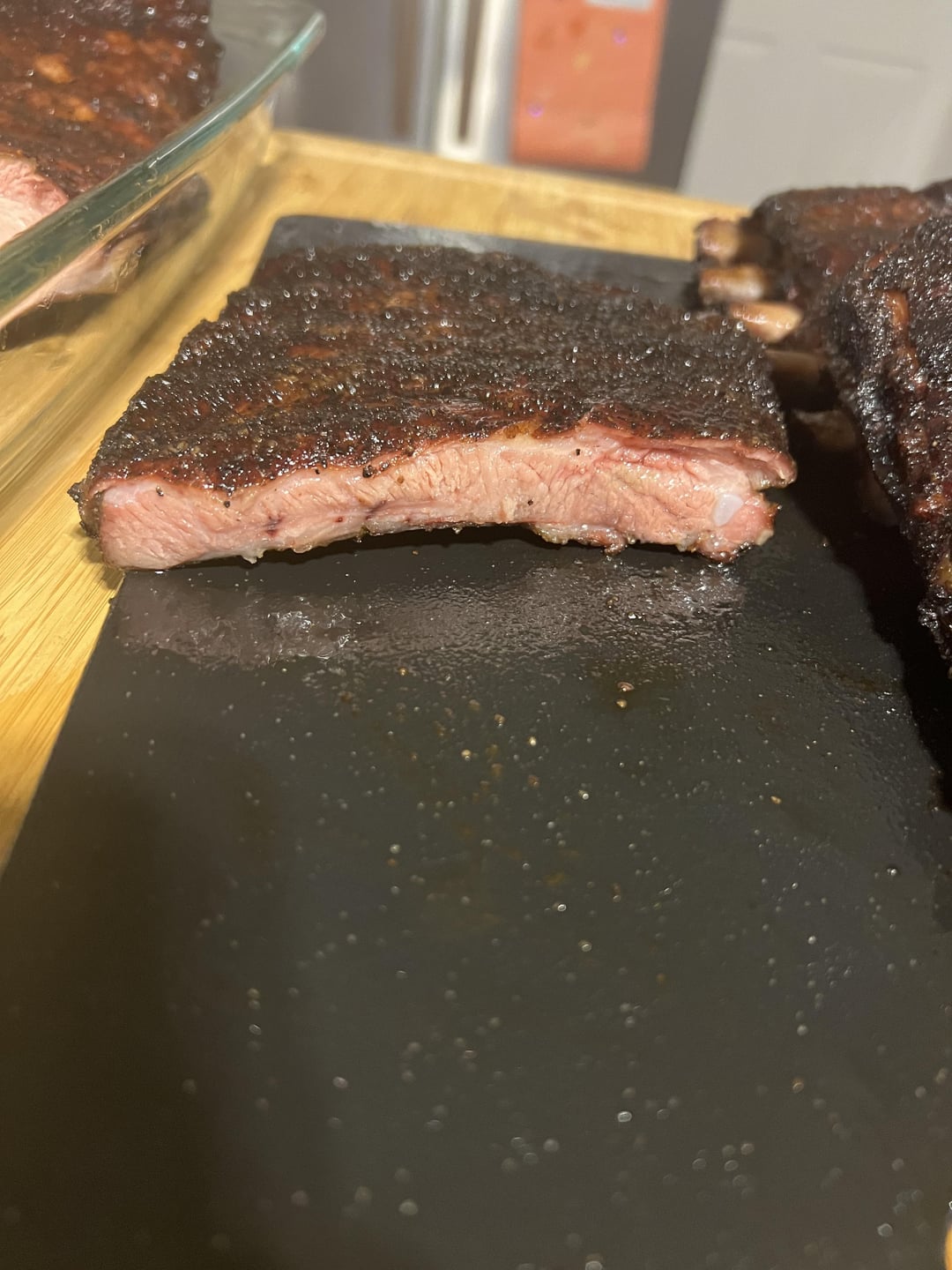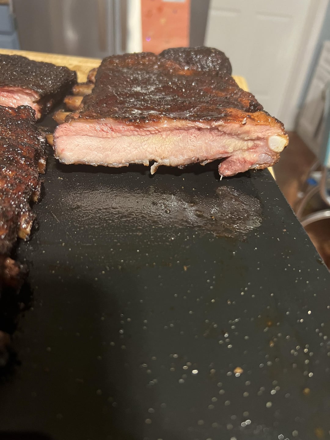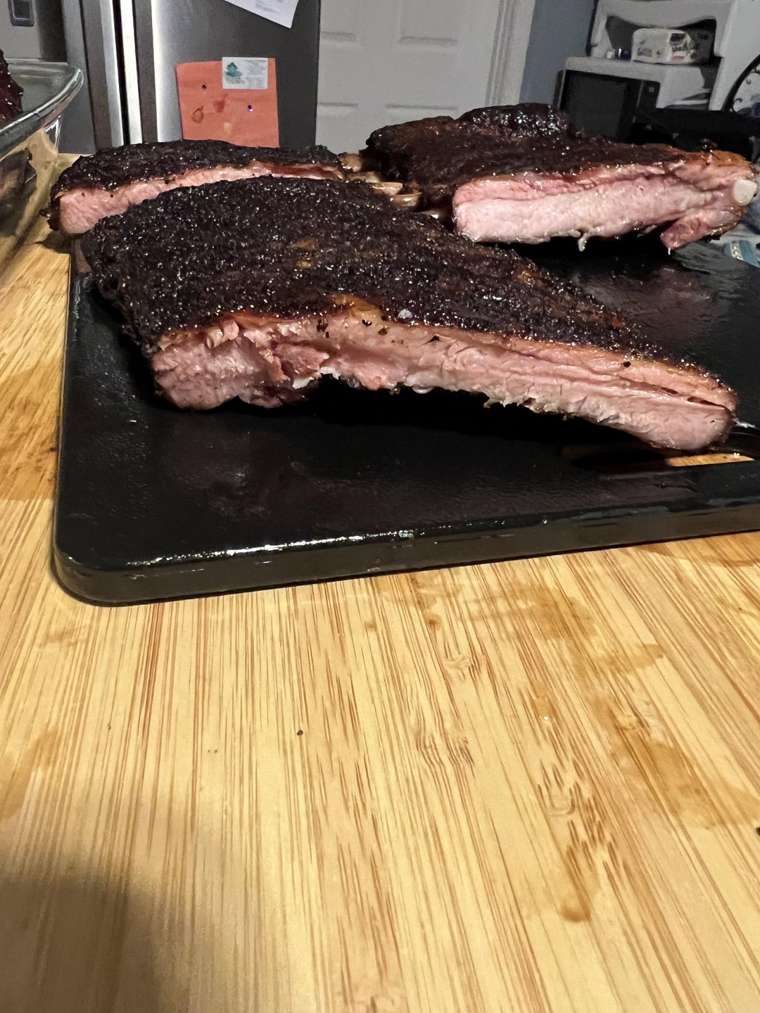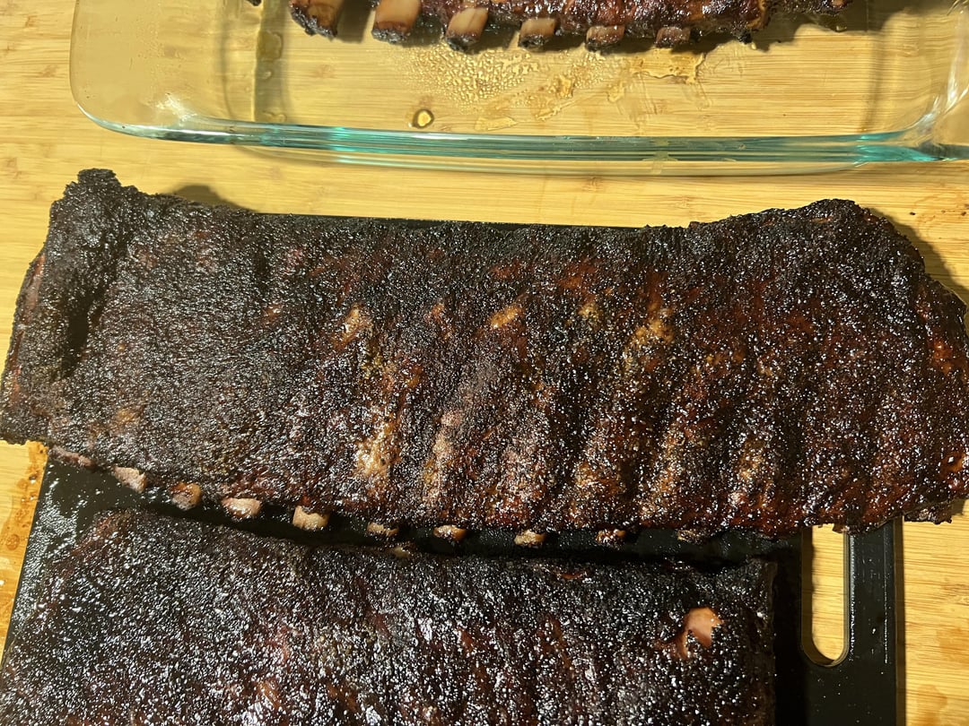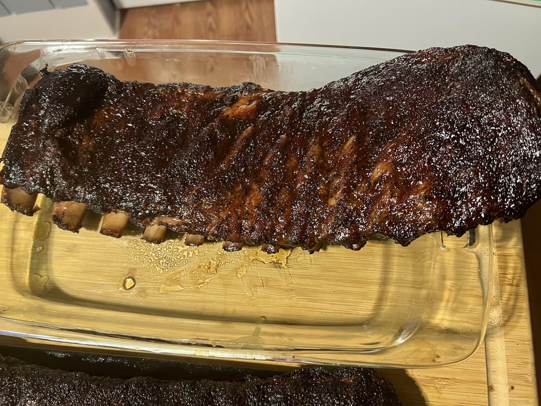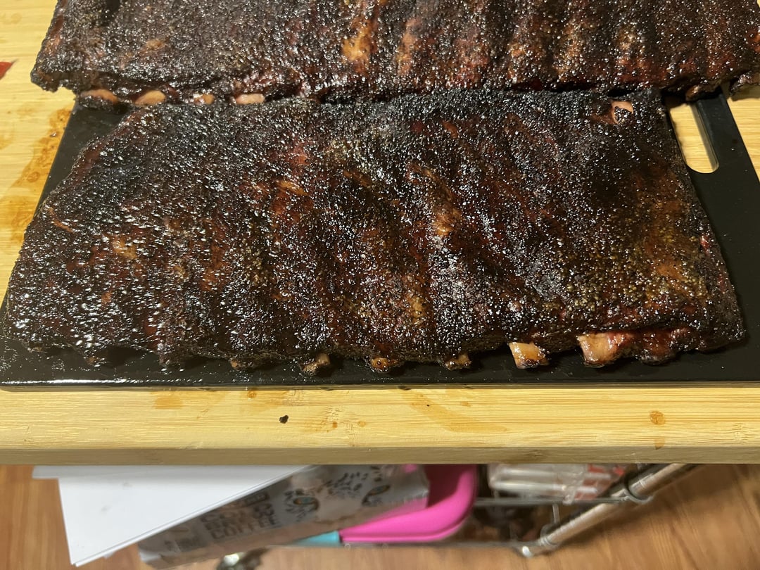 I can’t say it’s my best cook. The bark on one rack was slightly tough, and another rack had a bite that wasn’t as clean as I would have liked, but still turned out tasty. Three different rubs, one was Holy Gospel by Meat Church, the other was a blend of Lawry’s, fire salts, and pepper, and the last was a blend of Lawry’s, salt, pepper, and Deathwish instant coffee.