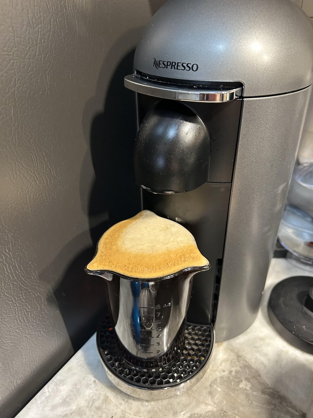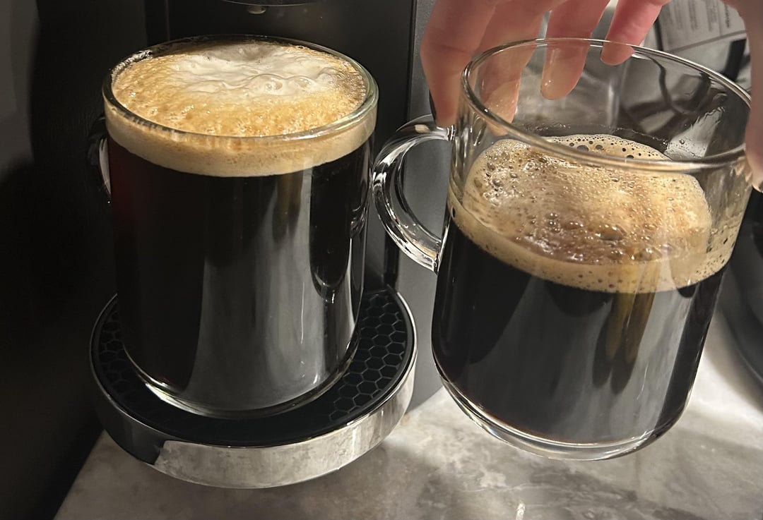 The Vertuo Plus allows you to customize the amount of water distributed for each type of pod. So if you turn it on, wait 30 seconds for it to warm up, add a pod, and then hold down the “start” button and don’t let go – it will start filling up your cup. When you want it to stop, let go. Next time it’ll remember that water volume for that type of pod.