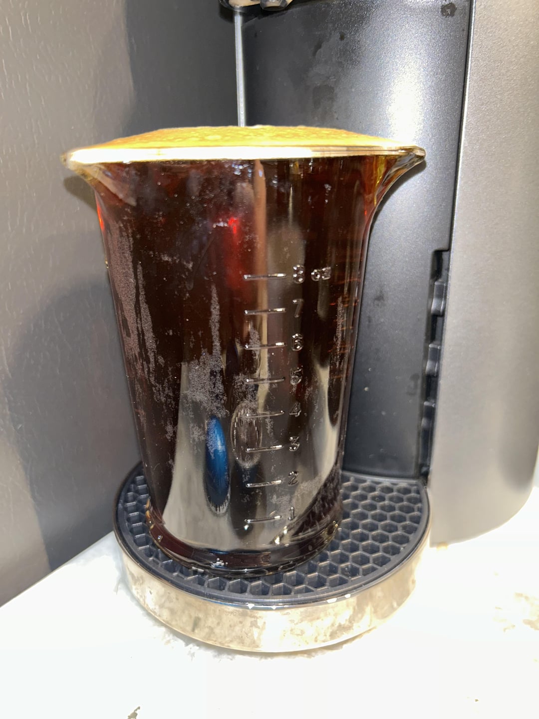 I bought two sleeves of these blue bottle pods and my machine hates them. I noticed yesterday so I went ahead and brewed regular coffee, some double espresso and one single espresso – all without error. In the two mugs are a blue bottle and a holiday brew – way different in pours. Each time I did a blue bottle coffee (5) it was overflowing way passed the 5oz brew and coffee was all separated in color.