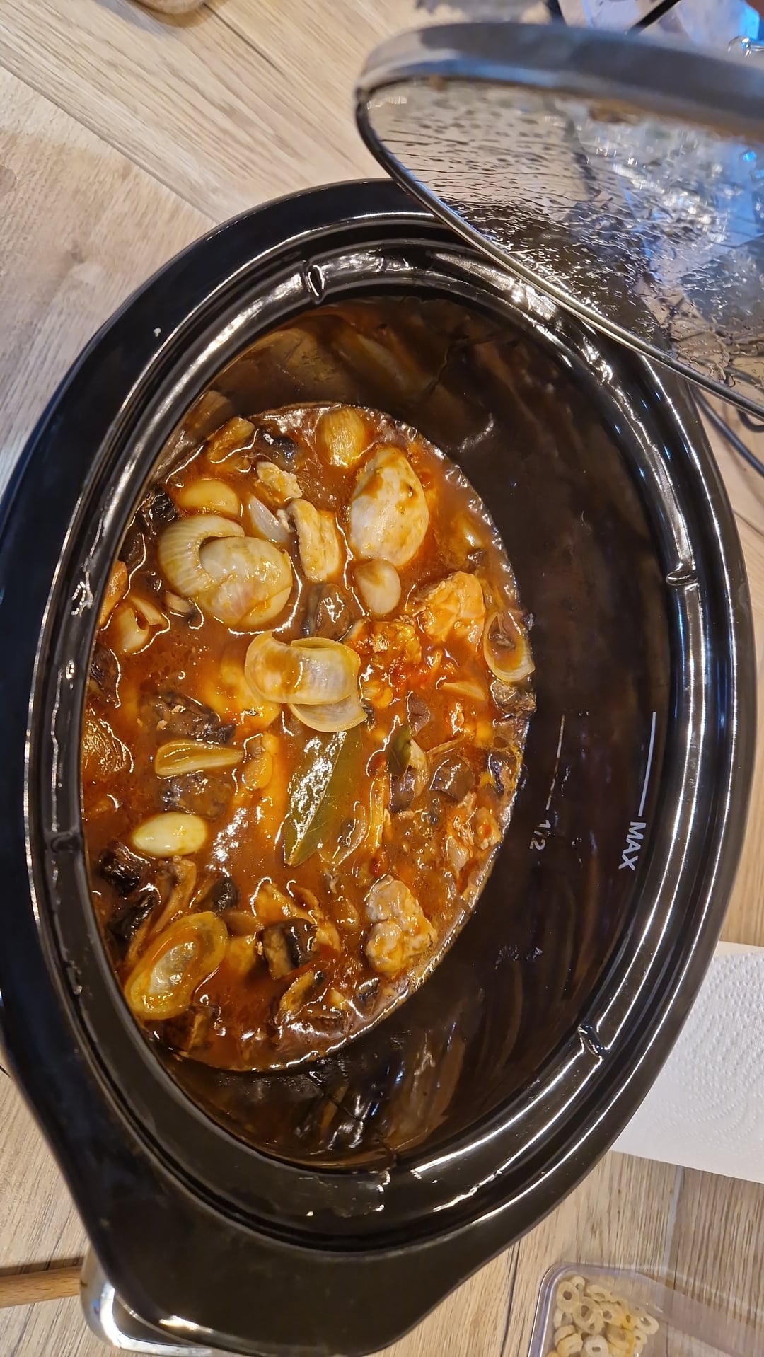 Also, I was under the impression you just bang it all in at the start and then it will all be done at the end but I’m wondering if I should be adding some of the veg later. Especially mushrooms.