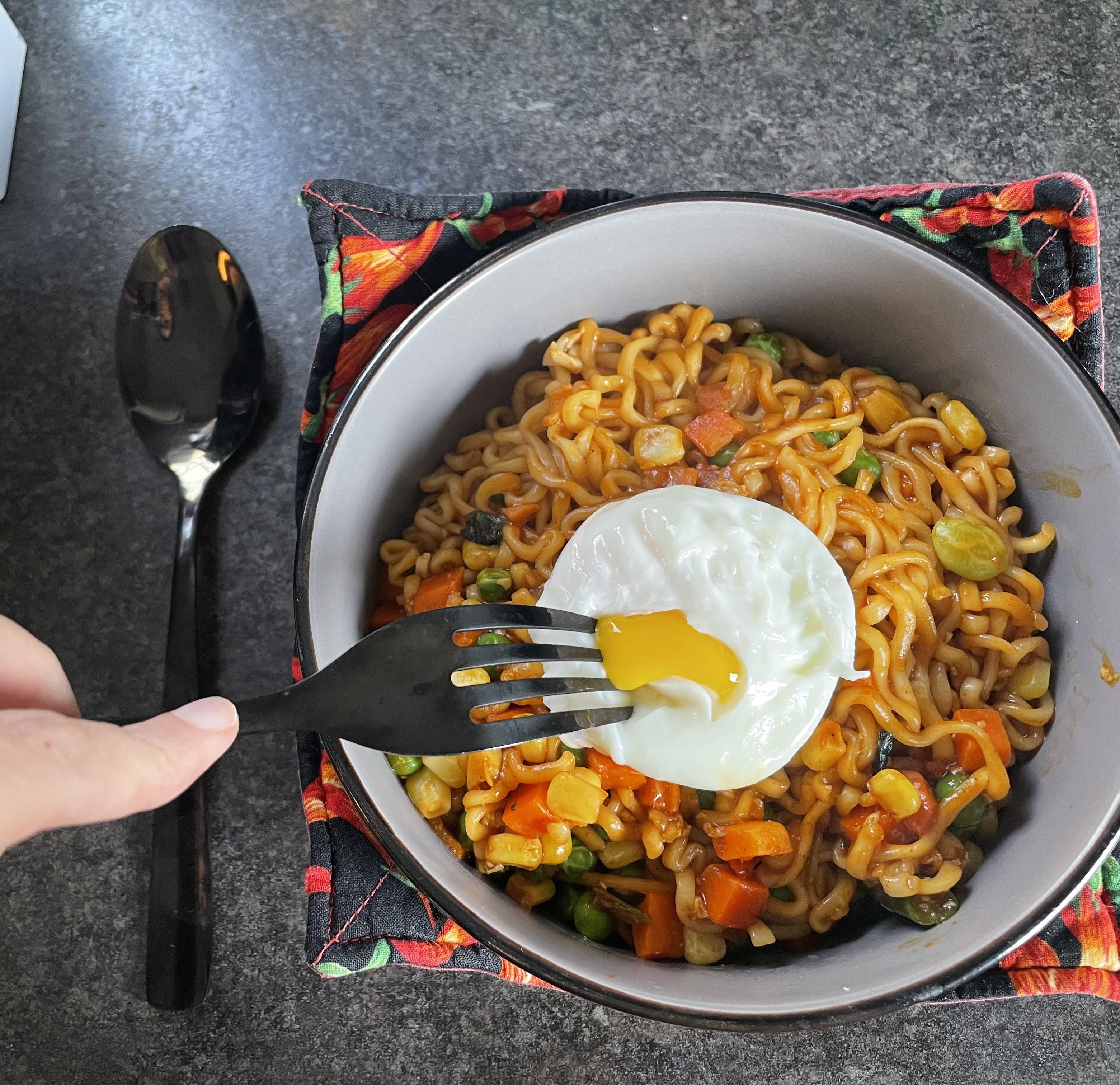 Samyang curry stir fry ramen with mixed veggies and a soft poached egg.