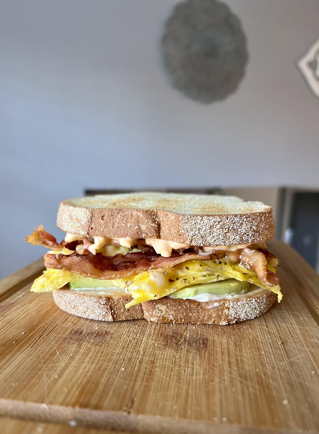 Made with bacon, eggs, avocado, mayo and jalapeño pimento cheese on sourdough toast. So tasty!