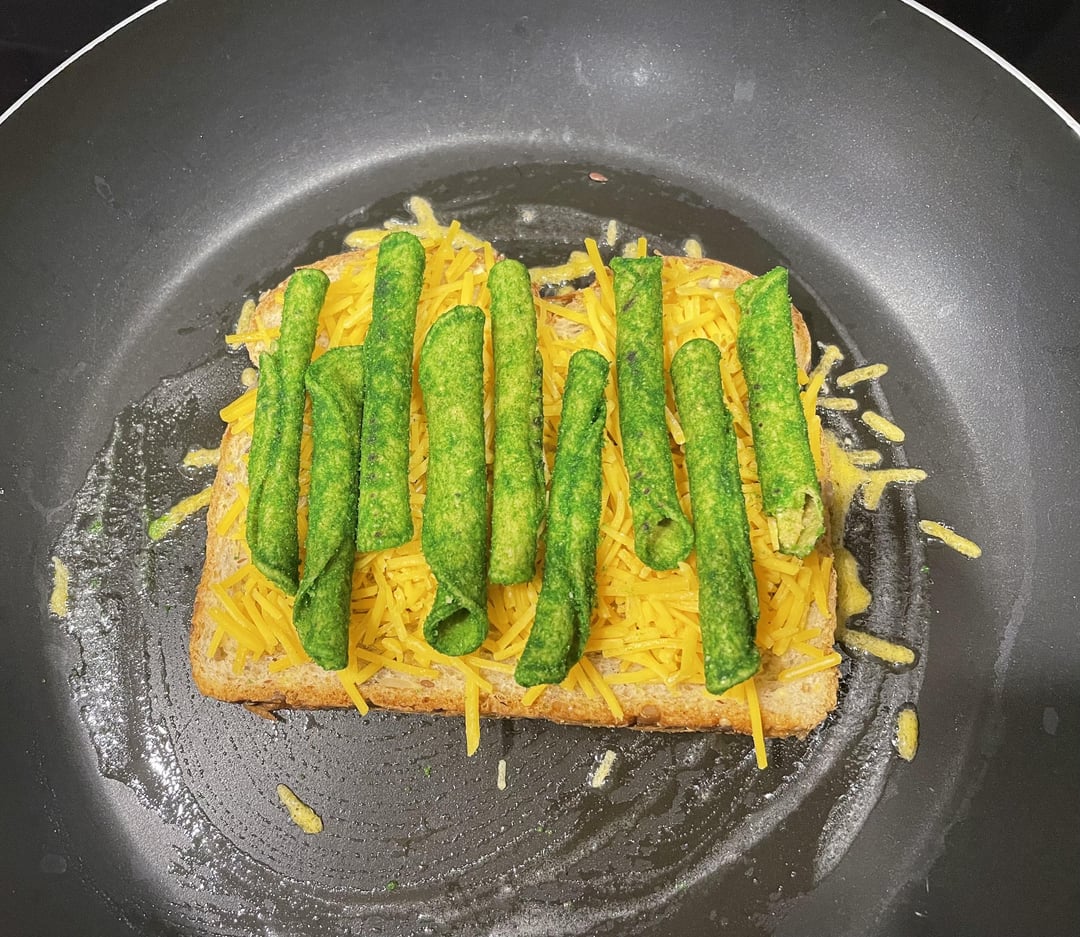 Got these habanero cucumber ‘Zombie’ Taki’s at a gas station (don’t ask me why, given that I don’t like normal Taki’s) and didn’t like them. Thought they might taste better in a grilled cheese, and I was right. 7/10, would eat again.