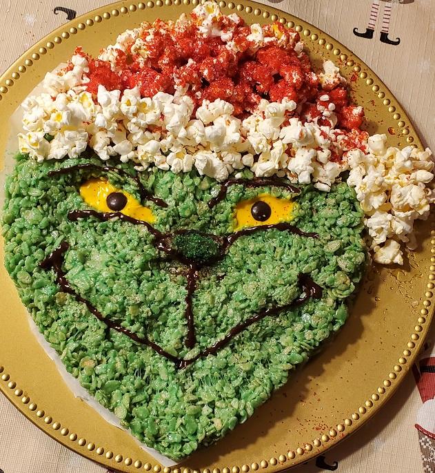 Grinch with Krispie Treats and a popcorn hat