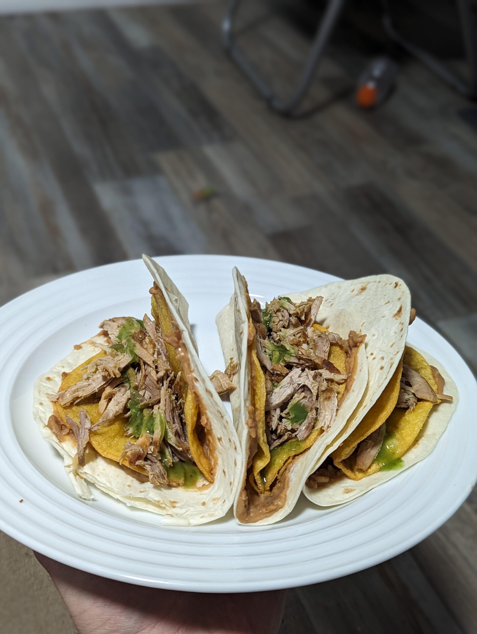 homemade double decker tacos with carnitas and yucateca green sauce