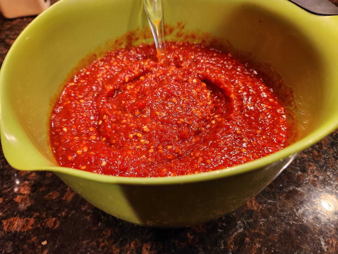 Red serrano peppers smoked for several hours, and then mixed in a food processor with onions, garlic, vinegar, brown sugar, and salt. Fantastic on quesadillas, chili, eggs, etc., anywhere where you want some heat, with a hint of sweet and smoke.